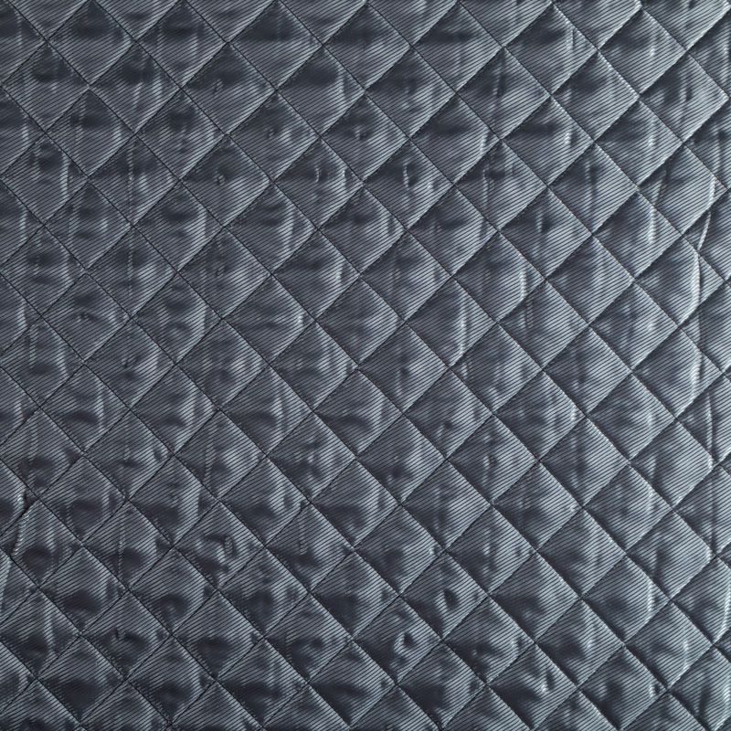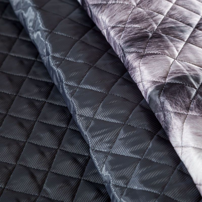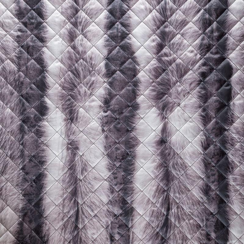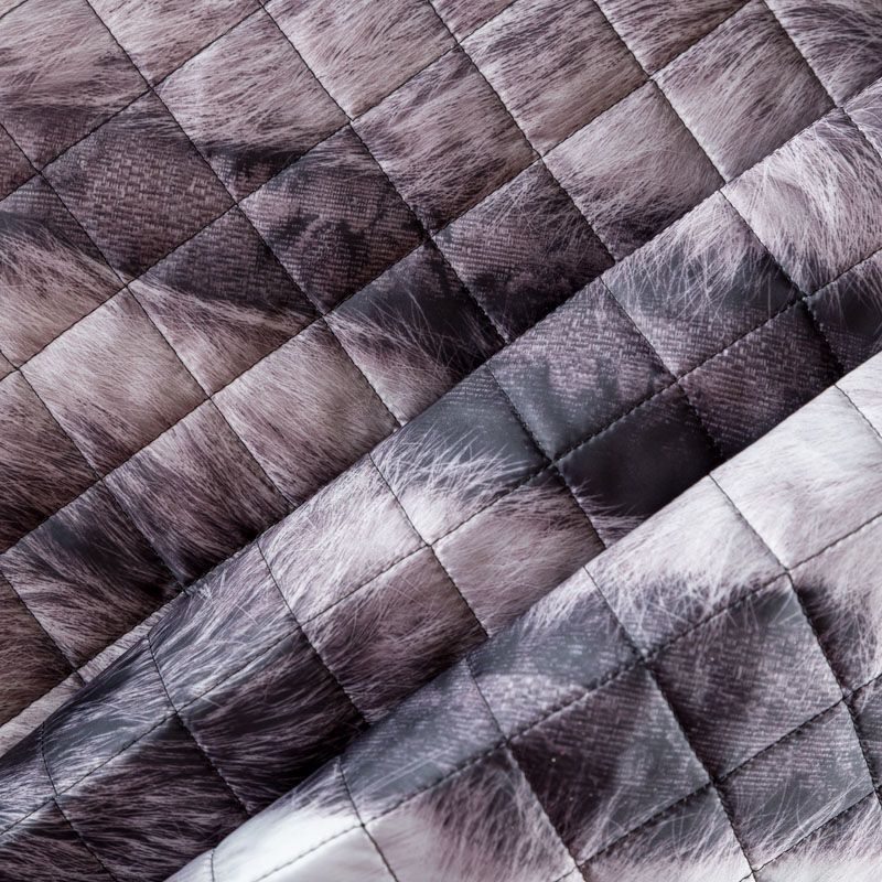 Трехслойная итальянская курточная ткань серого оттенка с принтом, имитирующим длиноворсый мех, простеганная не крупными ромбами. Нижний, черного цвета, заменяет подклад и верхний слой - полиэстер, по качеству напоминает болонь, между ними синтепон. Ткань легкая, пластичная, хорошо драпируется. Прекрасно подойдет для  пошива легких пальто, курток, бомберов, жилетов, накидок-кейпов, объемных сумок, одежды для домашних питомцев, туристического снаряжения.