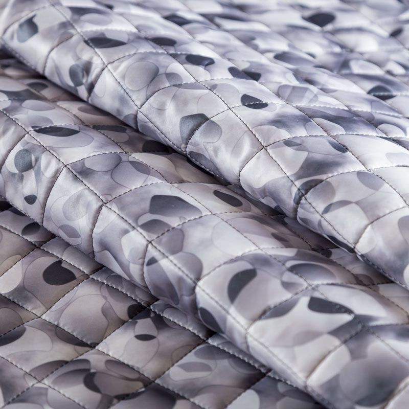 Трехслойная итальянская курточная ткань серого оттенка с абстрактным принтом, простеганная не крупными ромбами. Нижний, черного цвета, заменяет подклад и верхний слой - полиэстер, по качеству напоминает болонь, между ними синтепон. Ткань легкая, пластичная, хорошо драпируется. Прекрасно подойдет для пошива легких пальто, курток, бомберов, жилетов, накидок-кейпов, объемных сумок, одежды для домашних питомцев, туристического снаряжения.