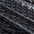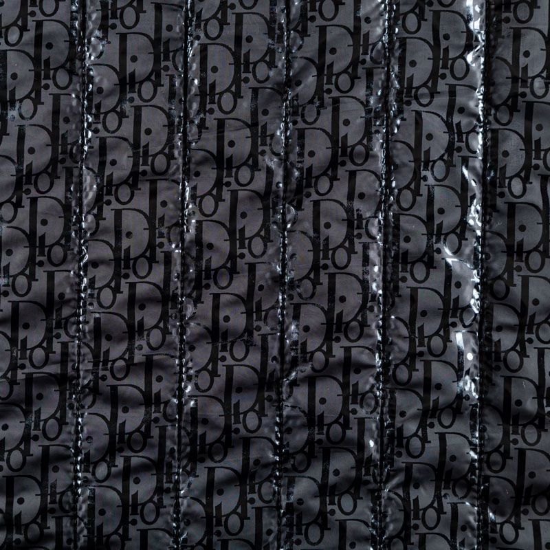 Итальянская двухслойная курточная ткань черного цвета с глитерным принтом лого известного бренда, простеганная вертикальными линиями вдоль кромки. Нижний слой - синтепон, верхний - полиэстер, по качеству напоминает болонь. Очень мягкая и легкая, пластичная, хорошо драпируется. Прекрасно подойдет для  пошива легких пальто, курток, жилетов, накидок-кейпов, комбинезонов, объемных сумок, одежды для домашних питомцев, туристического снаряжения.