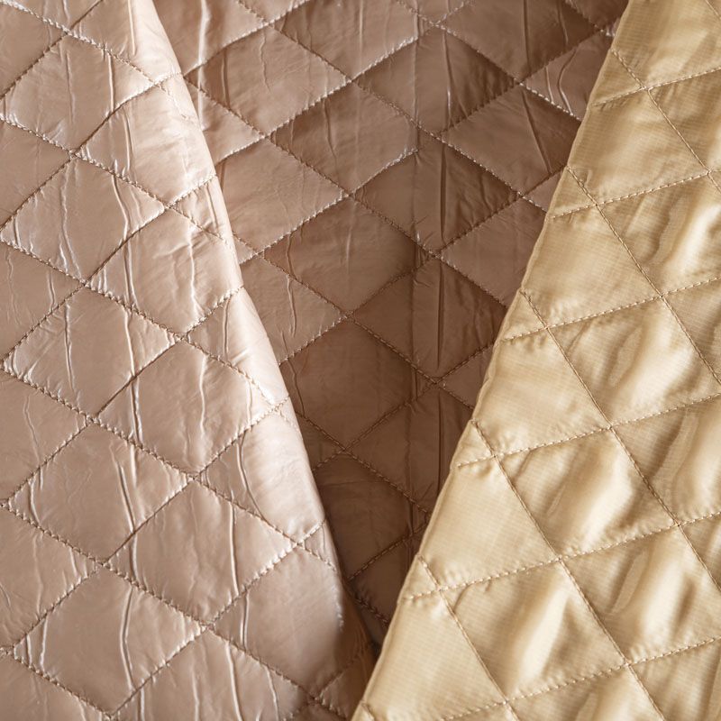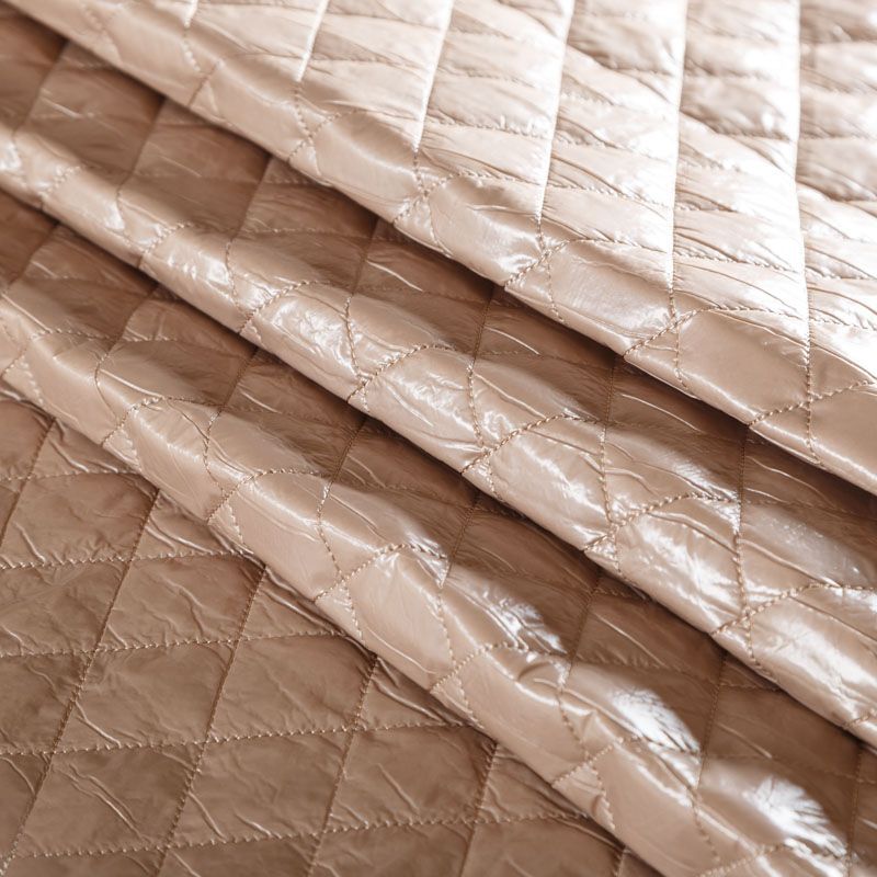 Трехслойная курточная ткань бежевого оттенка, простеганная не крупными ромбами. Нижний слой - матовый фактурный полиэстер, средний - тонкий синтепон, верхний - глянцевая гладкая плащевка. Очень мягкая и легкая, пластичная, хорошо драпируется. Прекрасно подойдет для пошива легких пальто, бомберов, парки, курток, жилетов, накидок-кейпов, объемных сумок.
