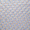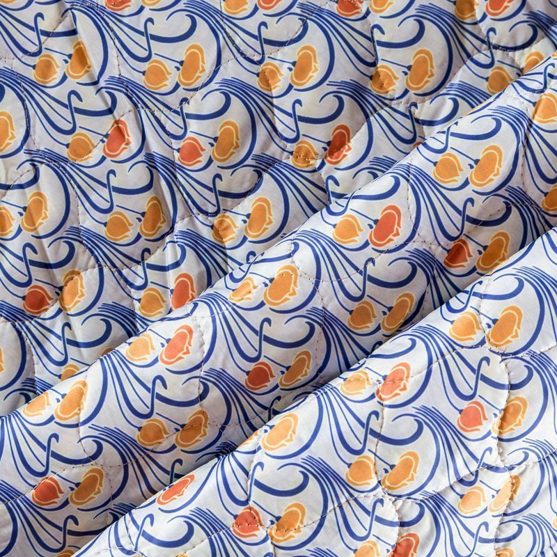 Трехслойная итальянская курточная ткань светлого оттенка со стилизованным узором в желто-синих цветах, простеганная фигурными линиями. Нижний слой синего цвета, средний слой - синтепон, верхний слой - принтованный матовый полиэстер. Ткань легкая, пластичная, хорошо драпируется. Прекрасно подойдет для  пошива легких пальто, курток, бомберов, жилетов, накидок-кейпов, объемных сумок, одежды для домашних питомцев, туристического снаряжения.