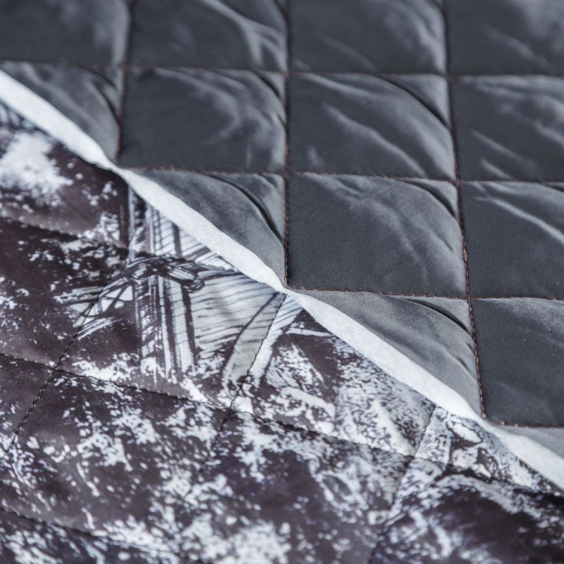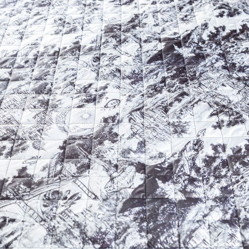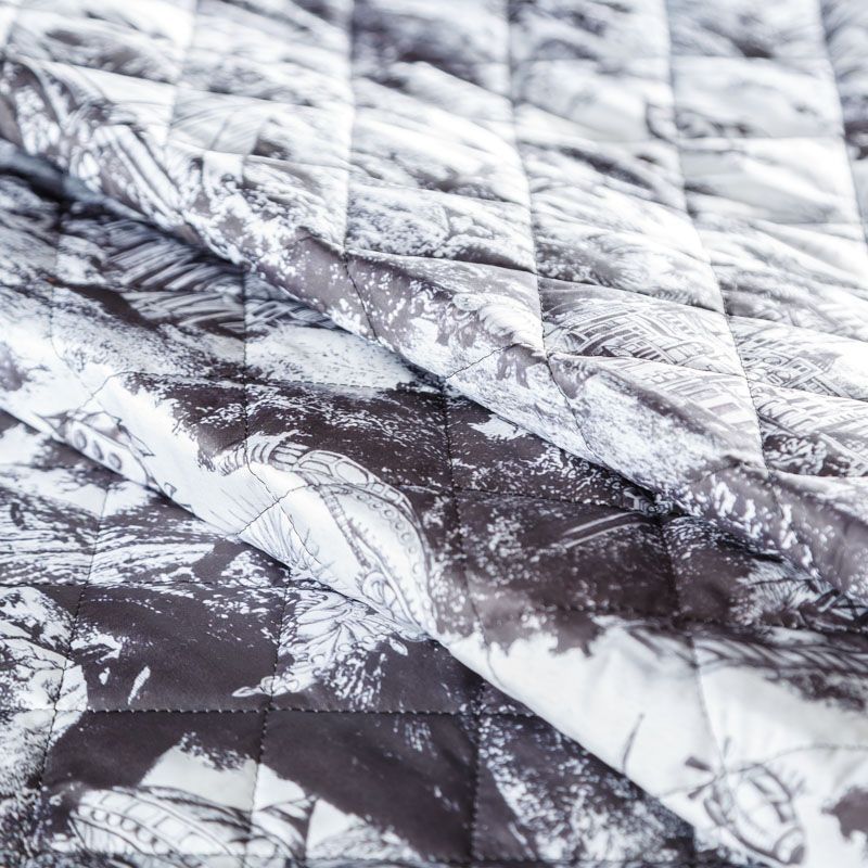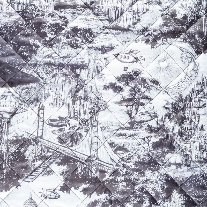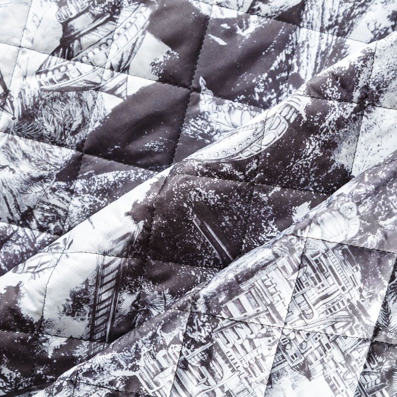 Итальяская трехслойная двухсторонняя курточная ткань белого цвета с черным орнаментом в стиле "туаль де Жуи", простеганная не крупными ромбами. Средний слой - воздушный синтепоновый утеплитель, нижний - матовый полиэстер черного цвета. Очень мягкая и легкая, пластичная, хорошо драпируется. Прекрасно подойдет для  пошива легких пальто, бомберов, парки, курток, жилетов, накидок-кейпов, объемных сумок.