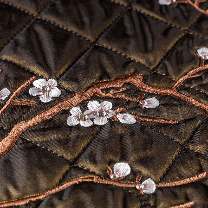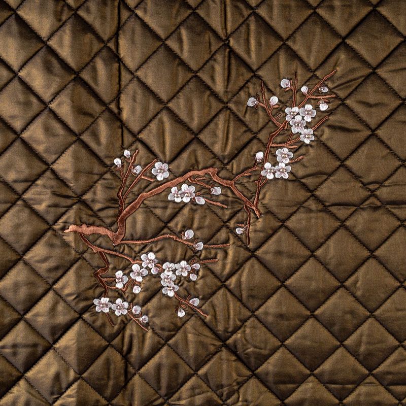 Курточный купон на синтепоне и подкладке, простеганный не крупными ромбами размером 3,5х3,5 см. С лицевой стороны тонкая, но прочная плащевая ткань с вышивкой в виде цветущей ветки сакуры, с изнаночной - однотонная ткань желтого цвета. Материал мягкий, объемный и "воздушный", хорошо держит форму и подойдет для пошива легких пальто, курток, жилетов, накидок-кейпов, парки.