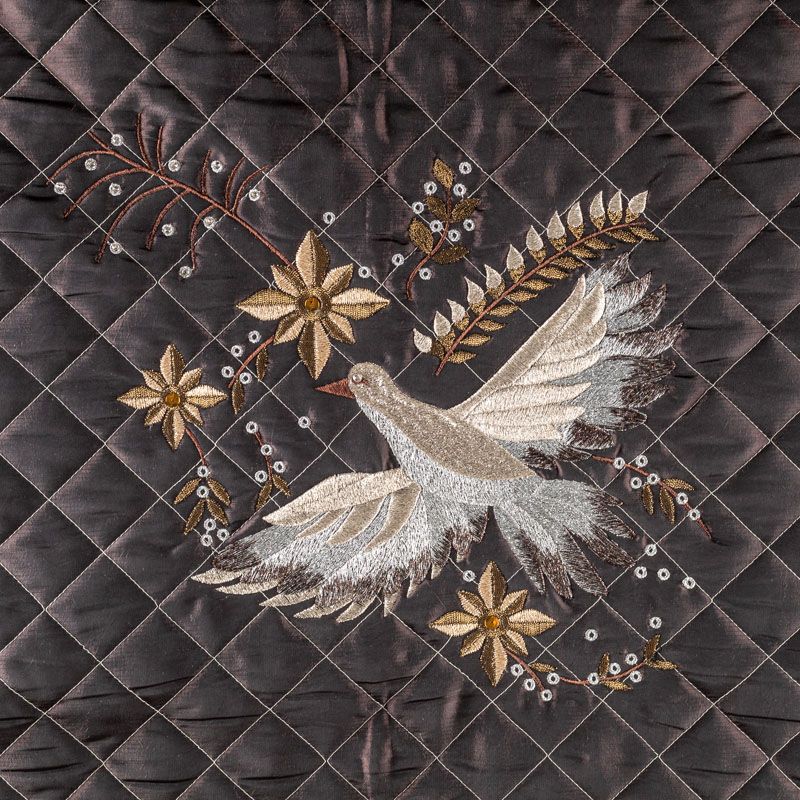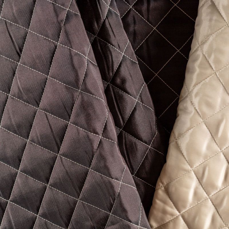 Курточный купон на синтепоне и подкладке, простеганный не крупными ромбами размером 3,5х3,5 см. С лицевой стороны тонкая, но прочная плащевая ткань с фантазийной вышивкой, с изнаночной - однотонная ткань песочного оттенка. Материал мягкий, объемный и "воздушный", хорошо держит форму и подойдет для пошива легких пальто, курток, жилетов, накидок-кейпов, парки.