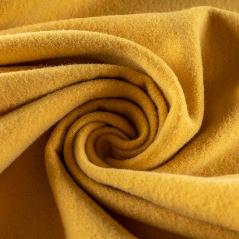 Плотная пальтовая ткань с коротеньким мягким ворсом на лицевой стороне и ровная на изнаночной. Она легко раскраивается, не скользит и не осыпается на срезах. Прекрасно подойдет для пошива женских пальто, теплых костюмов, кейпов, мягких бомберов, жилетов и головных уборов.