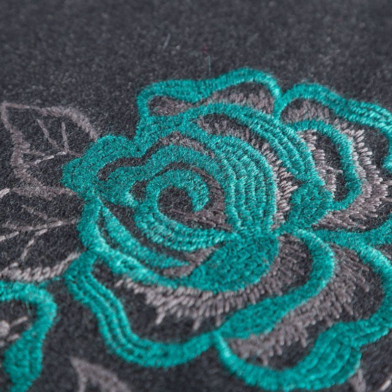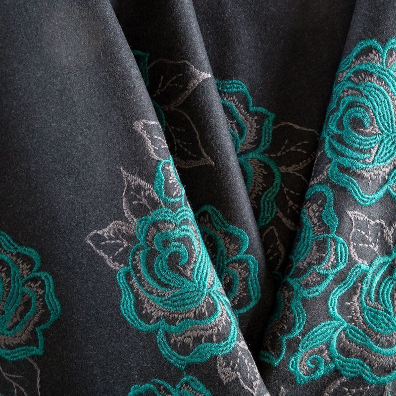 Пальтовая ткань из натуральной шерсти графитового оттенка с объемной цветочной вышивкой изумрудного цвета вдоль кромки, для пошива изделия набирается объемом. Ткань хорошей плотности, отлично держит форму, не деформируется, приятная на ощупь. Прекрасно подойдет для пошива ориганального пальто, жилета, теплой юбки или жакета.