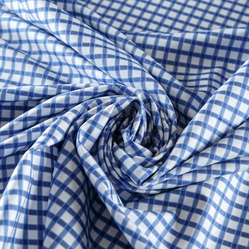 Итальянский плательно-рубашечный смесовый хлопок в синюю клеточку. Ткань мягкая, лёгкая, непрозрачная, пластичная и приятная к телу, хорошо драпируется, имеет гладкую матовую поверхность и сатиновое плетение. Прекрасно подойдет как для пошива платья-рубашки, сарафана, платьев различных фасонов, туники, топа, летнего костюма, комбинезона, детской и мужской одежды.