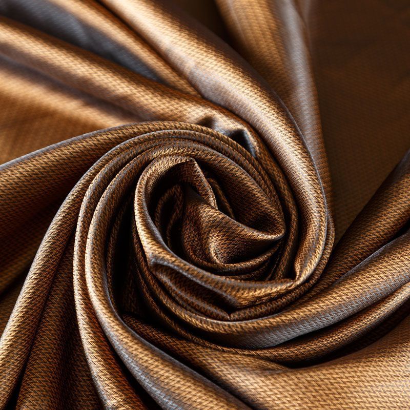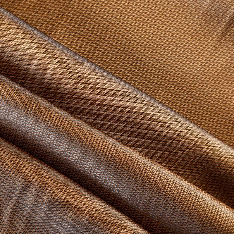 Смесовая подкладочная ткань золотисто-коричневого оттенка с жаккардовым геометрическим узором и красивым лоском. Полотно средней плотности, легкое, не просвечивает, хорошо скользит, не тянется. Подойдет для изготовления таких изделий, как пальто, костюмы, куртка, шуба, платье, жакет.