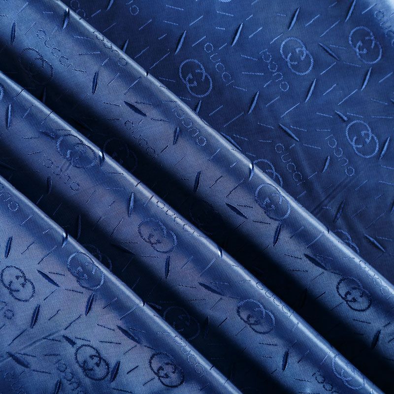 Смесовая подкладочная ткань синего оттенка с жаккардовым узором и красивым лоском. Полотно средней плотности, легкое, не просвечивает, хорошо скользит, не тянется. Подойдет для изготовления таких изделий, как пальто, костюмы, куртка, шуба, платье, жакет.