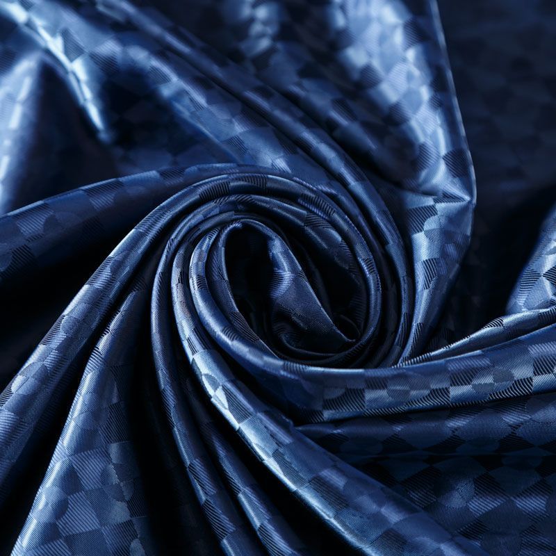 Смесовая подкладочная ткань синего оттенка с жаккардовым геометрическим узором и красивым лоском. Полотно средней плотности, легкое, не просвечивает, хорошо скользит, не тянется. Подойдет для изготовления таких изделий, как пальто, костюмы, куртка, шуба, платье, жакет.