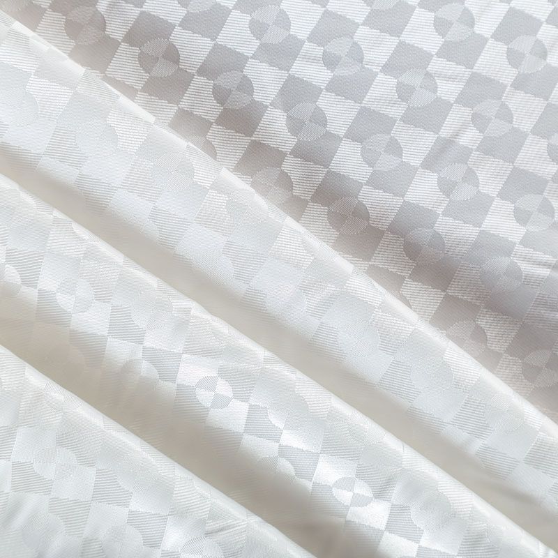 Смесовая подкладочная ткань белого оттенка с жаккардовым геометрическим узором и красивым лоском. Полотно средней плотности, легкое, не просвечивает, хорошо скользит, не тянется. Подойдет для изготовления таких изделий, как пальто, костюмы, куртка, шуба, платье, жакет.