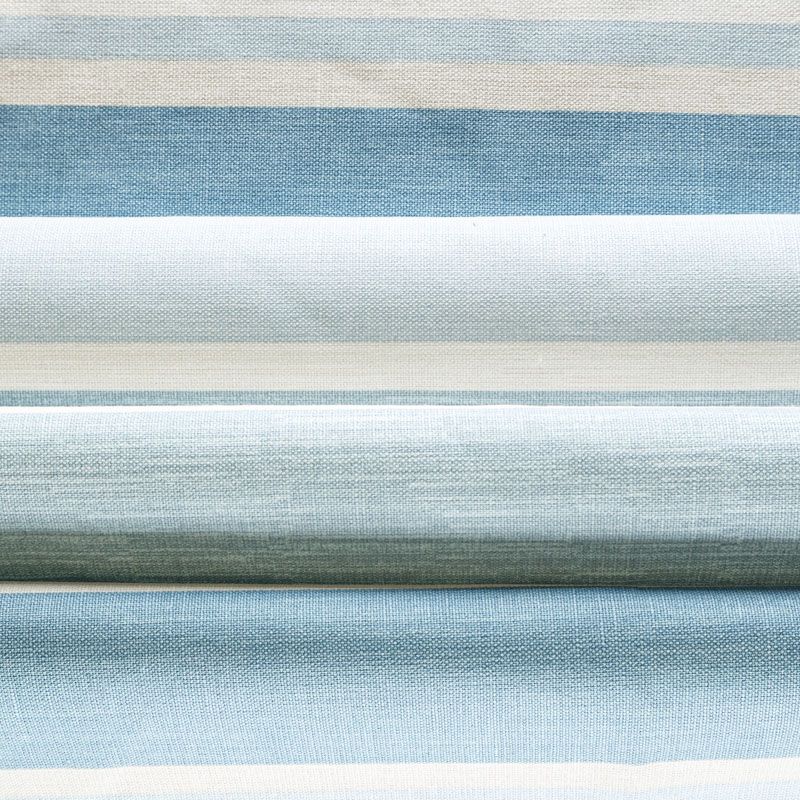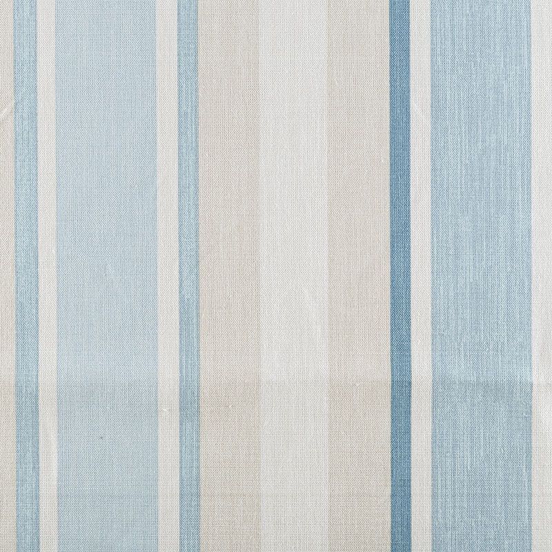 Матовая фактурная портьерная ткань в полоску, которая расположена вдоль кромки. Представлена в бежево-голубой палитре. Ткань средней плотности, без блеска, хорошо драпируется, имеет полонтяное переплетение. Прекрасно впишется в самые разные стилевые направления (прованс, кантри). Можно использовать для пошива портьер, римской шторы, салфеток, столового белья, подушек, покрывал и других предметов текстильного интерьера.