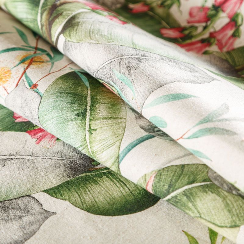 Декоративный смесовый хлопок с тропическим растительным принтом от испанского производителя Visatex. Ткань средней плотности, приятная и гладкая на ощупь. Интересный вариант для пошива штор, декоративных подушек и покрывал, изготовления текстильных элементов в кухнях-столовых, гостинных, спальнях и даже детских.