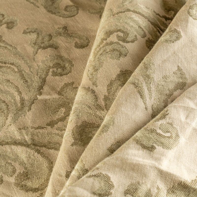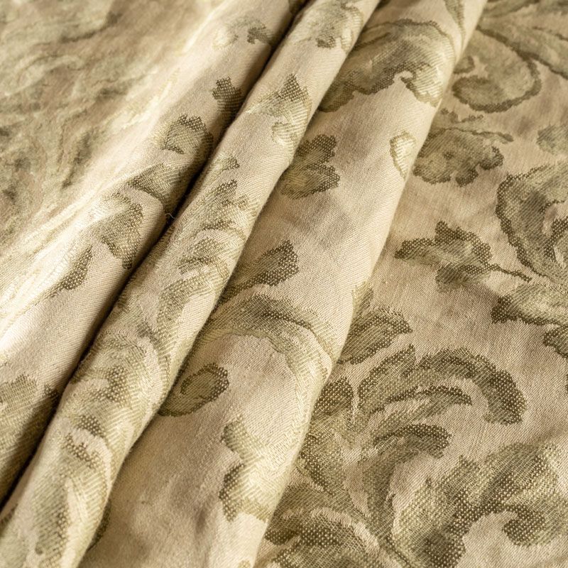 Натуральная льняная жаккардовая портьера с классическим растительным орнаментом в зеленой цветовой гамме. Ткань плотная, тяжелая, может драпироваться в большие складки. Лен подойдет для плотных штор, покрывал, подушек, скатертей и салфеток, обивки мебели, Прекрасно впишется в интерьер как в совеременном стиле, так и в стиле прованс.