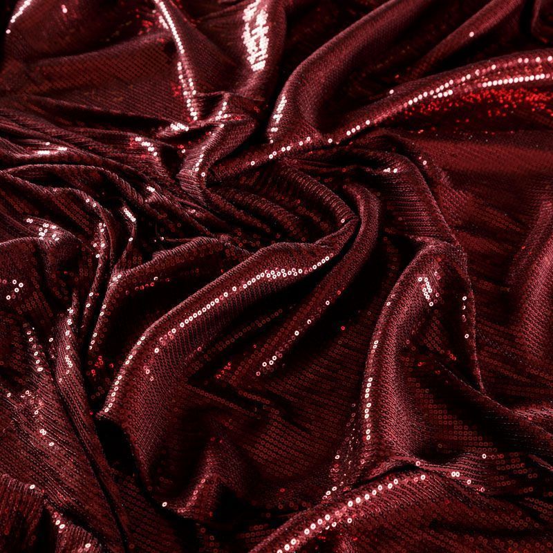 Блестящие пайетки благородного багрового оттенка. Мелкие, размером около 3 мм. Основа - трикотажное полотно, комфортное в носке. Ткань не прозрачная, тянется.  Подойдет для вечернего коктельного платья или юбки, комбинезона, топа, танцевальных и сценических костюмов.
