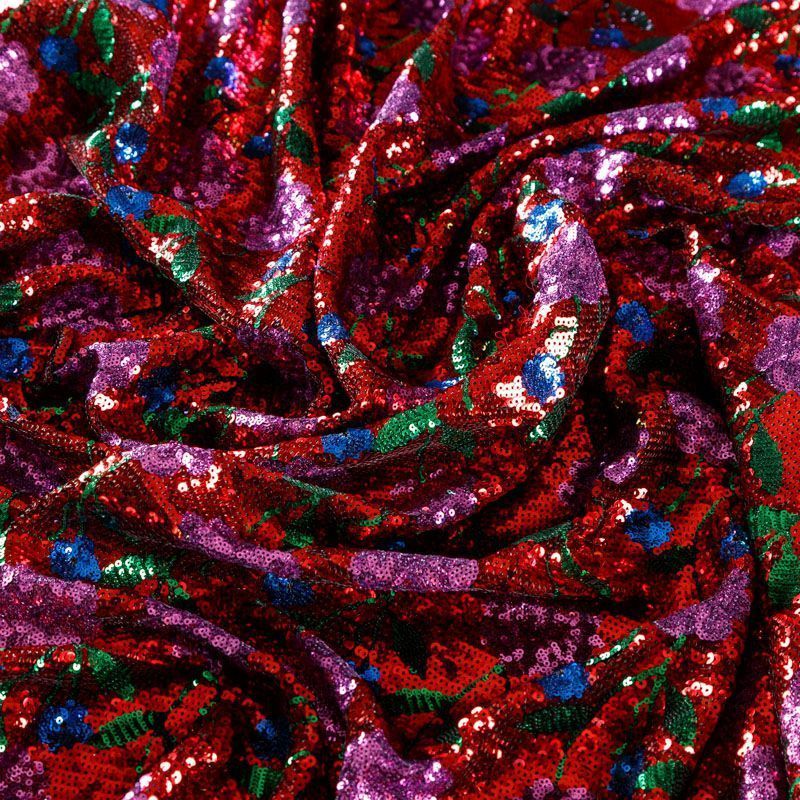 Эластичная сетка черного цвета по всей поверхности усеяна глянцевыми пайетками, который образуют яркий цветочный рисунок на красном фоне. Ткань очень хорошо драпируется, красиво переливается, имеет глянцевый блеск, пластичная и эластичная. Пайетки — идеальный материал для праздников и вечеринок. Из них получится эффектное платье, жакет, боди, туника, юбка или комбинезон.