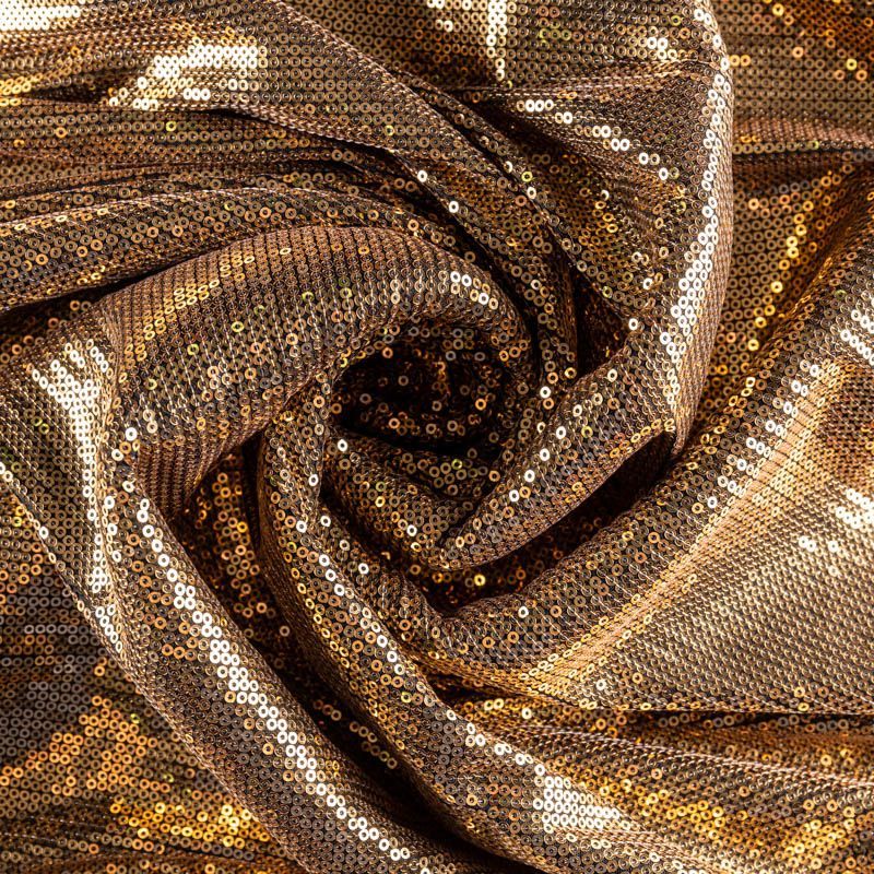 Блестящие пайетки золотого оттенка. Мелкие, размером около 3 мм. Основа - черное трикотажное полотно, комфортное в носке. Ткань не прозрачная, тянется. Подойдет для вечернего коктельного платья или юбки, комбинезона, топа, танцевальных и сценических костюмов.