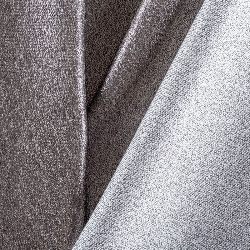 Двухслойный двусторонний итальянский хлопковый трикотаж костюмно-пальтовой плотности. Цвет одной стороны - серый меланж, вторая сторона - серебристая. Материал мягкий, пластичный, хорошо тянется, не просвечивает. Прекрасно подойдет для пошива кардиганов, пальто, пончо, юбок и платьев в спортивном стиле.