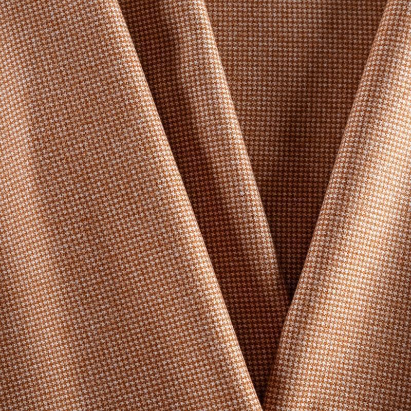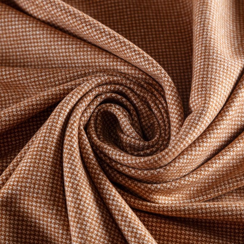 Трикотаж средней толщины, хорошо тянется за счет эластана в составе. Мелкий ненавязчивый узор "гусиная лапка" образуется переплетением бежевых и молочных нитей. Ткань не сухая, мягкая, но плотная, не просвечивает, теплая, уютная, хорошо драпируется. Отлично подойдет для пошива легкой верхней одежды, жакетов, костюмов, юбок.