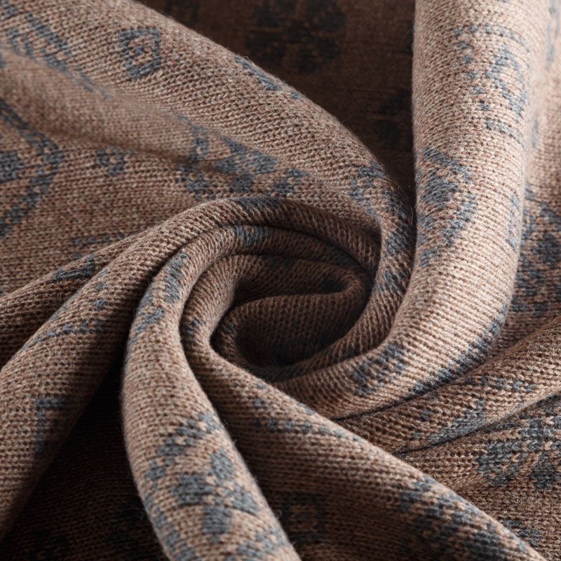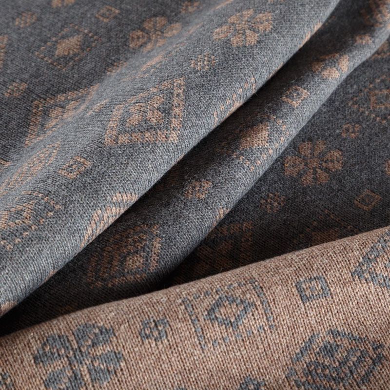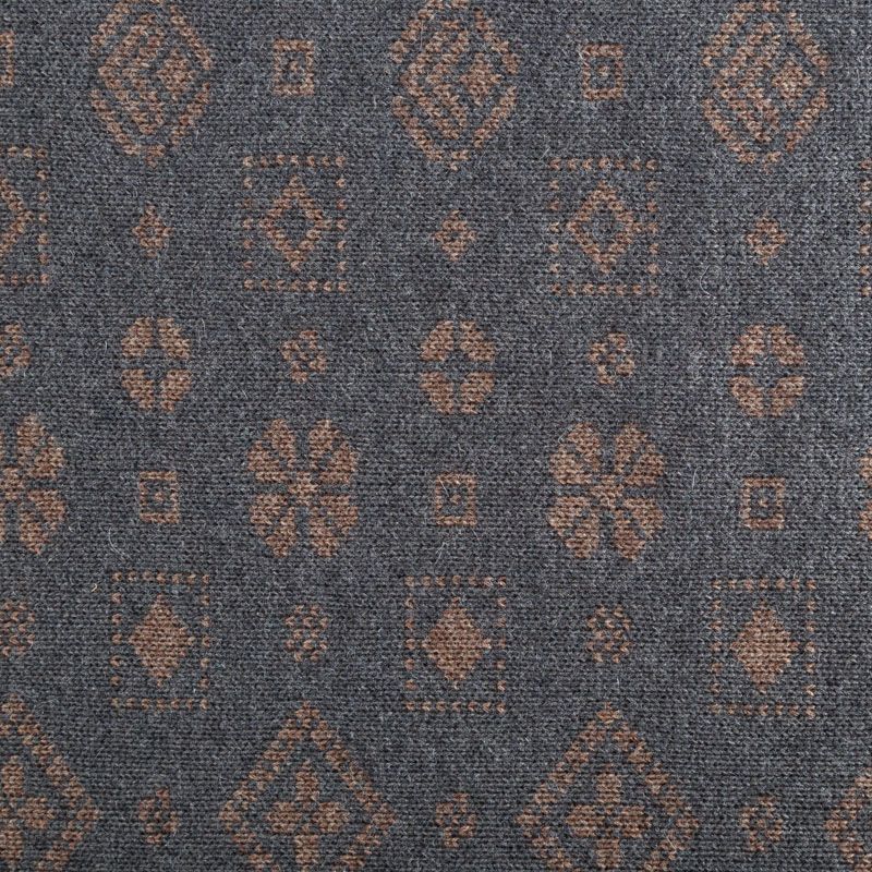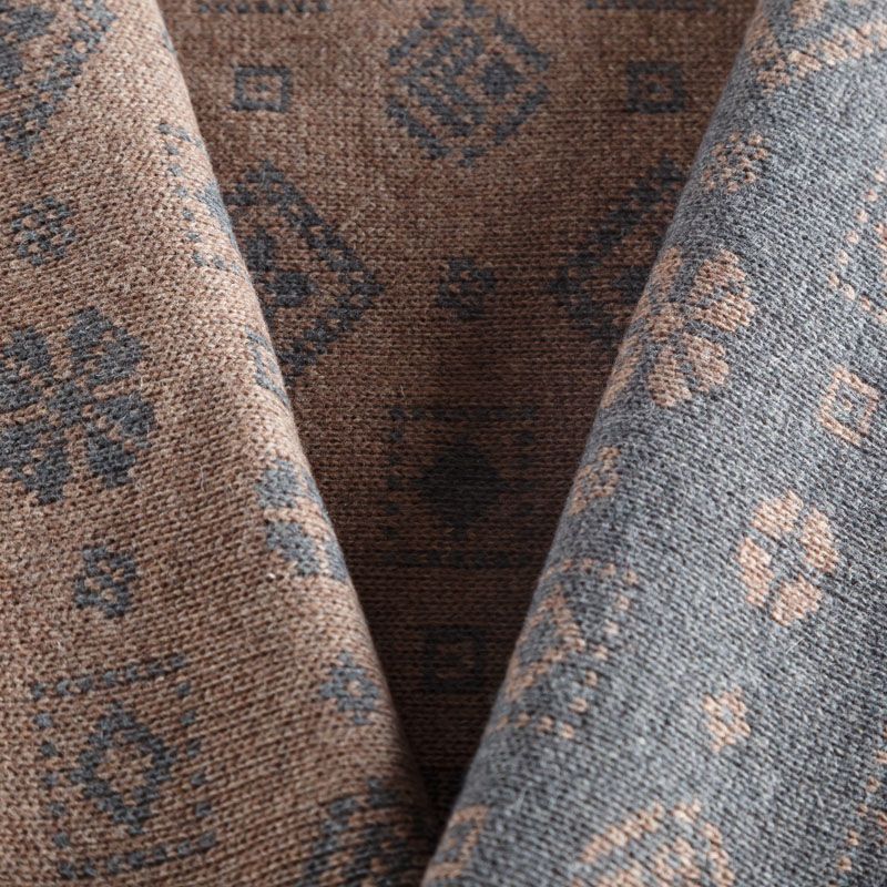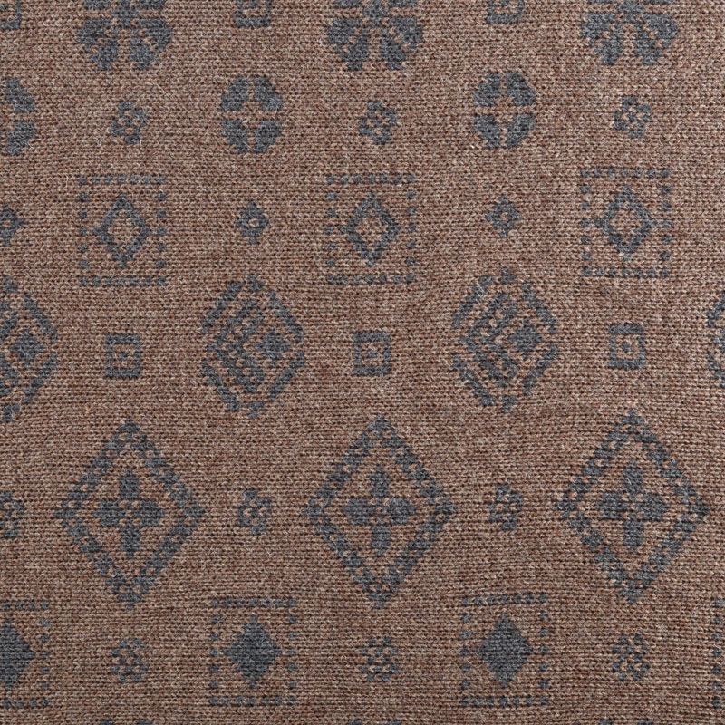 Итальянский теплый мягкий вязаный шерстяной трикотаж, два слоя которого соединены между собой жаккардовым геометрическим узором. Полотно очень пластичное, приятное на ощупь, не колется. При соответствующей обработке швов одежду из этого трикотажа можно носить на обе стороны. Подойдет для пошива теплых уютных свитеров, кардиганов, пальто, костюмов, теплого платья, свитшота, джемпера.