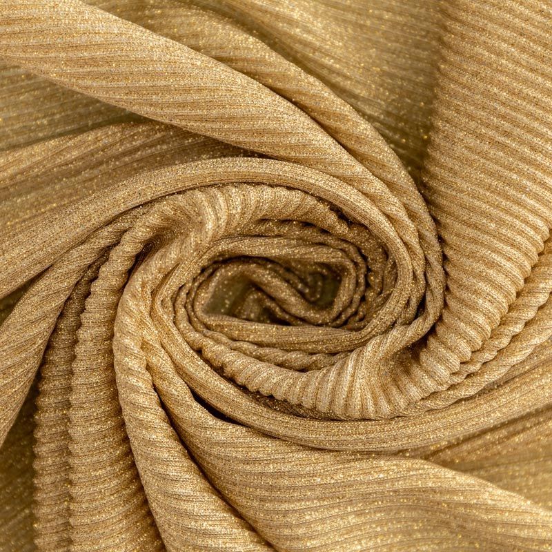 Легкая, слегка прозрачная ткань, с высокой степенью эластичности, поверхность рельефная за счет эффекта гофре и мерцающая за счет напыленного  люрекса. Идеальна для облегающих изделий с использованием подклада, платья, топа, юбки, брюк, кардигана. Полоски гофре расположены поперек кромки, набирается объемом.