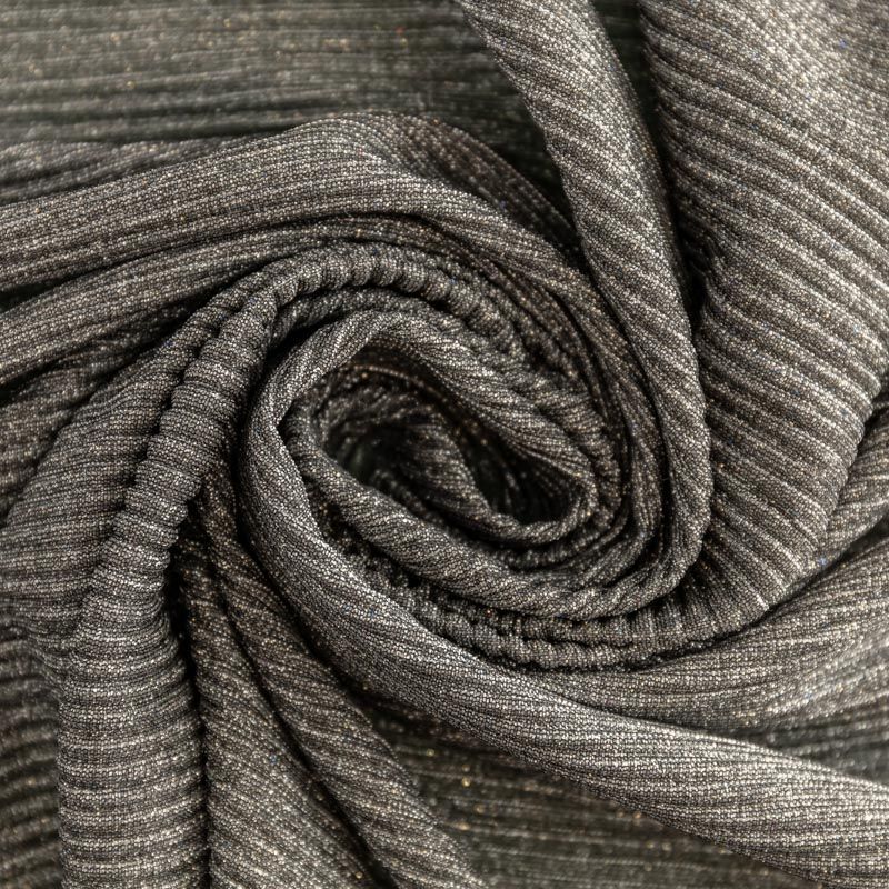Легкая, слегка прозрачная ткань, с высокой степенью эластичности, поверхность рельефная за счет эффекта гофре и мерцающая за счет напыленного  люрекса. Идеальна для облегающих изделий с использованием подклада, платья, топа, юбки, брюк, кардигана. Полоски гофре расположены поперек кромки, набирается объемом.
