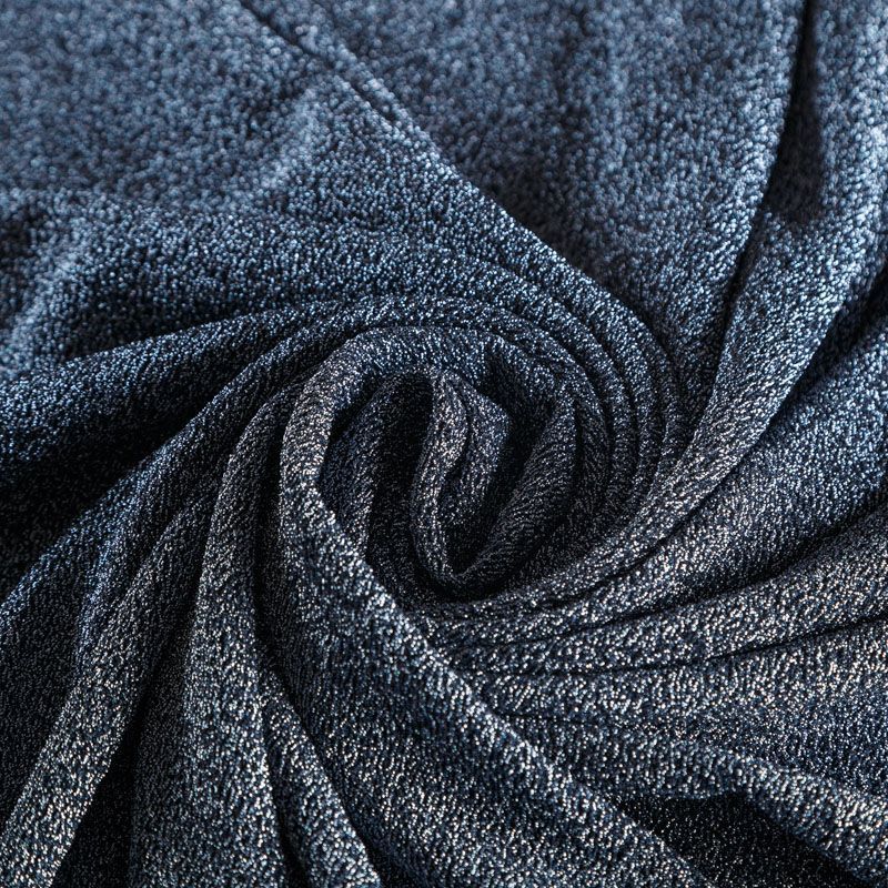 Трикотажное полотно с металлизированным блеском и мерцанием. Люрексные нити голубого оттенка вплетены в структуру полотна и создают объемный "вспененный" эффект, при этом изнанка гладкая и ровная. Ткань очень приятная к телу, не колется, не просвечивается, очень эластичная, отлично драпируется и ниспадает, красиво ляжет по фигуре. Идеальный вариант для пошива вечерних и нарядных платьев облегающего и свободного силуэта, топов, комбинезона, юбки, широких брюк, туник, кардиганов, накидок.