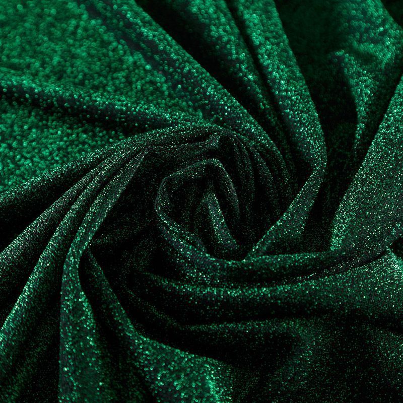 Трикотажное полотно с металлизированным блеском и  мерцанием. Люрексные нити зеленого оттенка вплетены в структуру полотна и создают объемный "вспененный" эффект, при этом изнанка гладкая и ровная. Ткань очень приятная к телу, не колется, не просвечивается, очень эластичная, отлично драпируется и ниспадает, красиво ляжет по фигуре. Идеальный вариант для пошива вечерних и нарядных платьев облегающего и свободного силуэта, топов, комбинезона, юбки, широких брюк, туник, кардиганов, накидок.