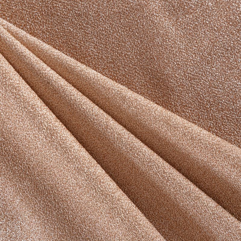 Трикотажное полотно с металлизированным блеском и  мерцанием. Люрексные нити вплетены в структуру полотна и создают объемный "вспененный" эффект, при этом изнанка гладкая и ровная. Ткань очень приятная к телу, не колется, не просвечивается, очень эластичная, отлично драпируется и ниспадает, красиво ляжет по фигуре. Идеальный вариант для пошива вечерних и нарядных платьев облегающего и свободного силуэта, топов, комбинезона, юбки, широких брюк, туник, кардиганов, накидок.