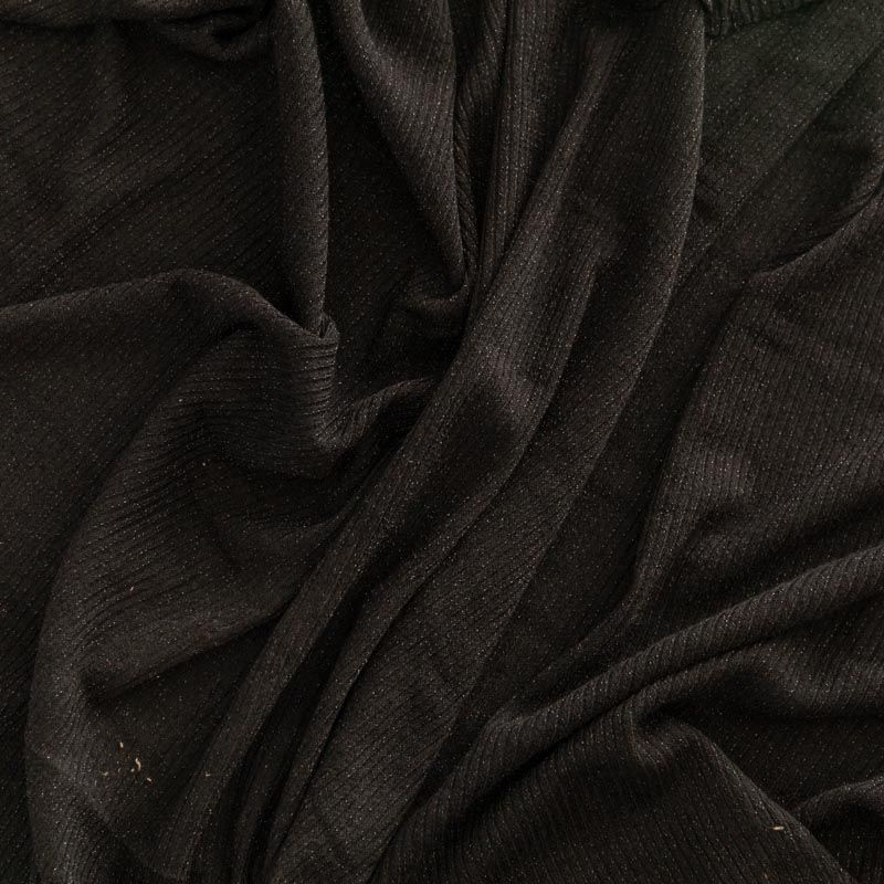 Трикотаж-лапша черного цвета с серебристой люрексовой нитью. Мягкая и эластичная ткань, великолепно драпируется и красиво облегает. Прекрасно подходит для изделий по фигуре, а также нарядов с мягкими складками. Трикотаж можно использовать для вечерних образов — платья, блузки, топы, кардигана и боди.