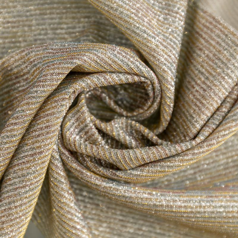 Мягкое и эффектное трикотажное полотно с металлизированным напылением. Структура полотна плотная, легко растяжимая, эластичная. С лицевой стороны поверхность ткани  слегка шероховатая на ощупь, характеризуется заметным блеском «металлик». С изнанки трикотаж гладкий, комфортный, подходит для использования без подклада. Отлично пододет для пошива водолазки, платья, топа, леггинсов, спортивных купальников, нарядных изделий.