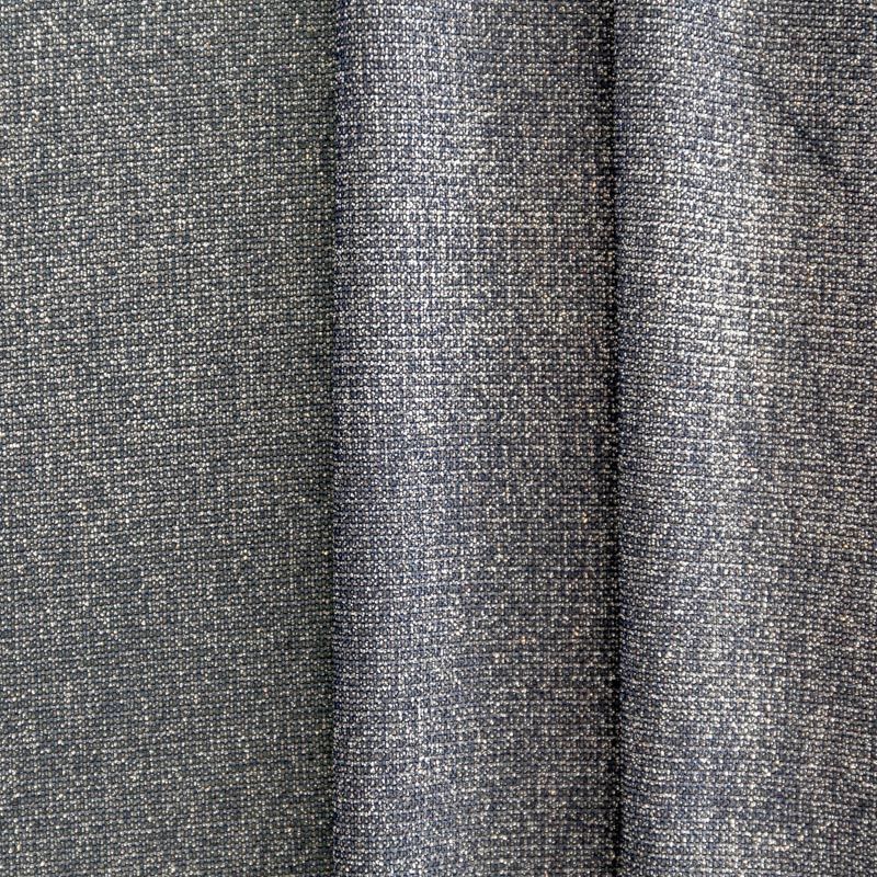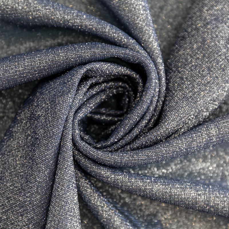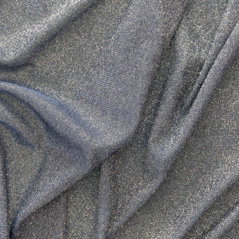 Мягкое и эффектное трикотажное полотно с металлизированным напылением. Структура полотна плотная, легко растяжимая, эластичная. С лицевой стороны поверхность ткани  слегка шероховатая на ощупь, характеризуется заметным блеском «металлик». С изнанки трикотаж гладкий, комфортный, подходит для использования без подклада. Отлично пододет для пошива водолазки, платья, топа, леггинсов, спортивных купальников, нарядных изделий.