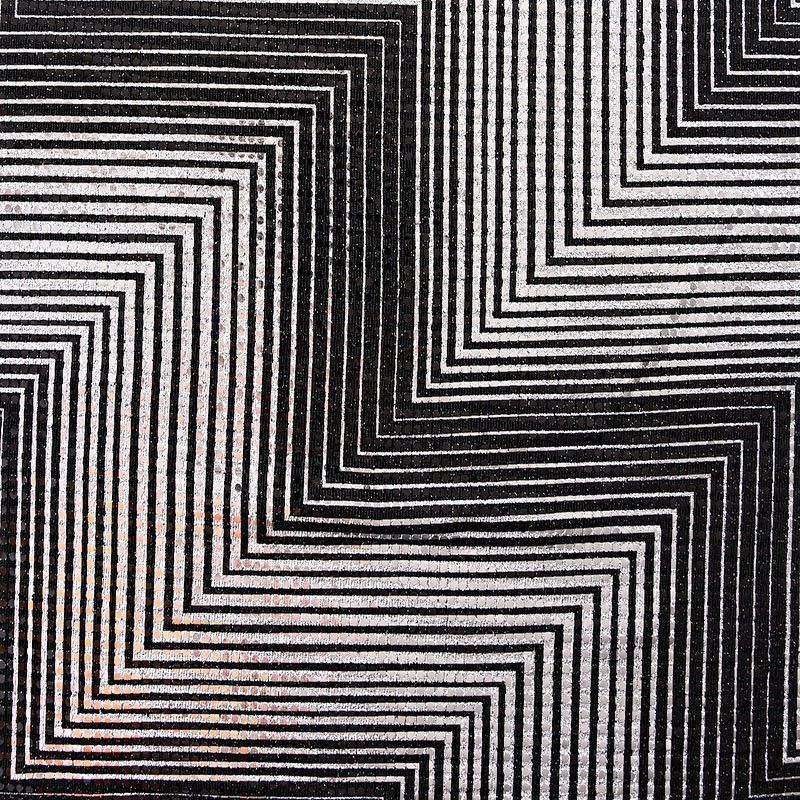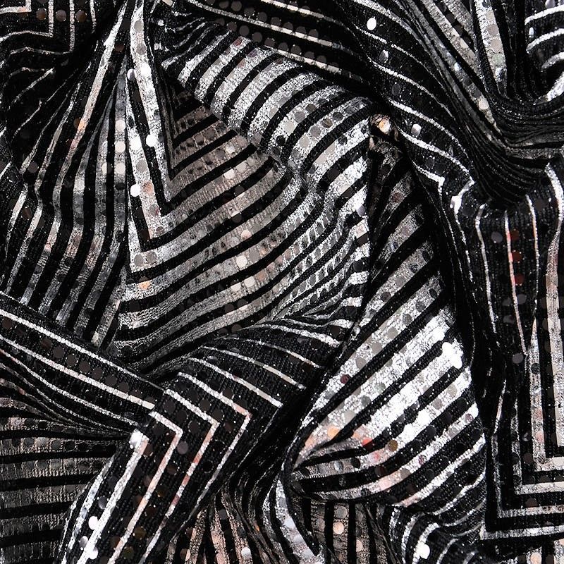 Трикотажное черное полотно серебристым геометрическим узором и деликатными прозрачными круглыми пайетками. Декор накатан на основу, поэтому будет комфортен в носке. Ткань пластичная, прекрасно драпируется и укладывается в складки, легко садится по фигуре за счёт основы с эластаном, не прозрачная, позволит шить изделия без подклада. Идеально подойдет для пошива нарядных вечерних образов: платья, юбки, топа, туники, широких брюк, жакета, кардигана.