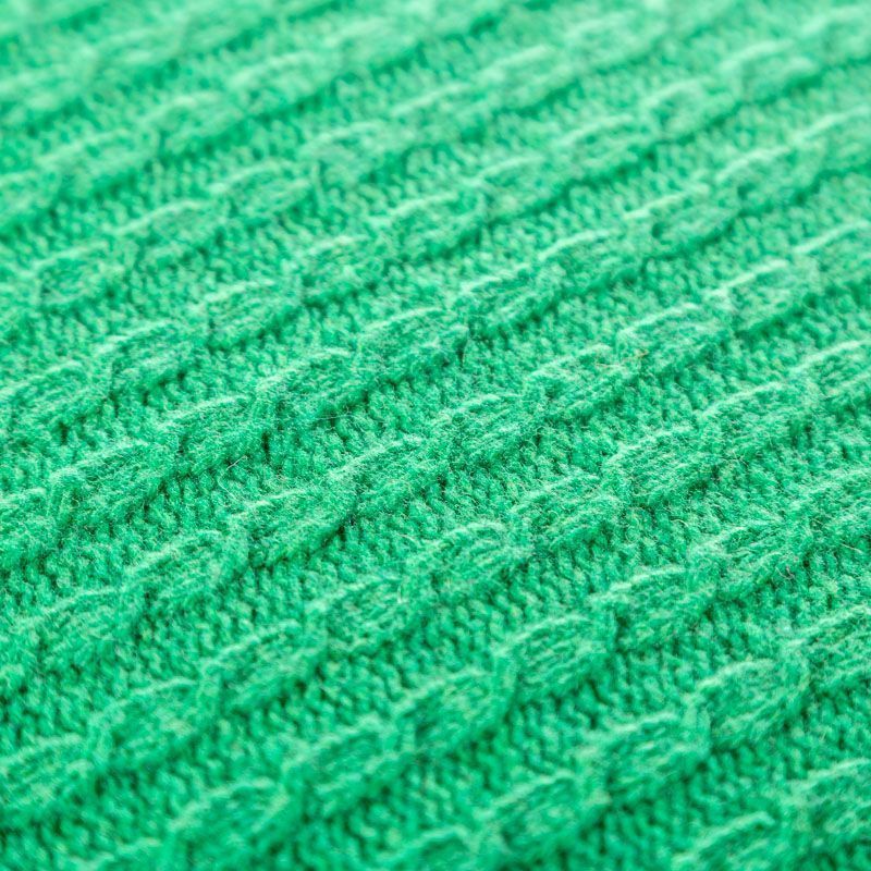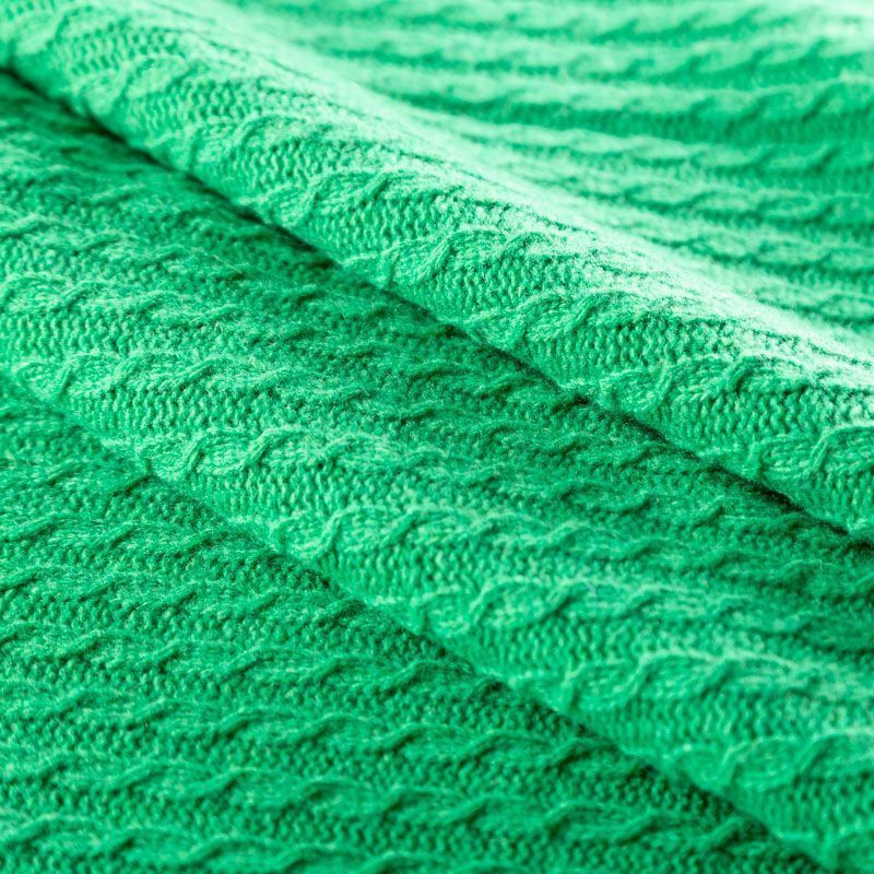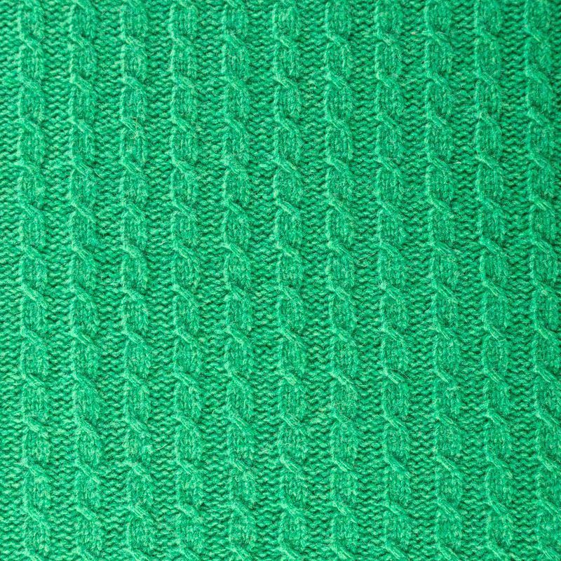 Итальянский шерстяной трикотаж зеленого оттенка с ажурными вязаными "косами". Полотно плотное, мягкое, эластичное, не просвечивает. Прекрасно подойдет для пошива теплых и уютных свитеров, кардиганов, жилета, платьев, шарфов, палантинов, пончо или снудов.