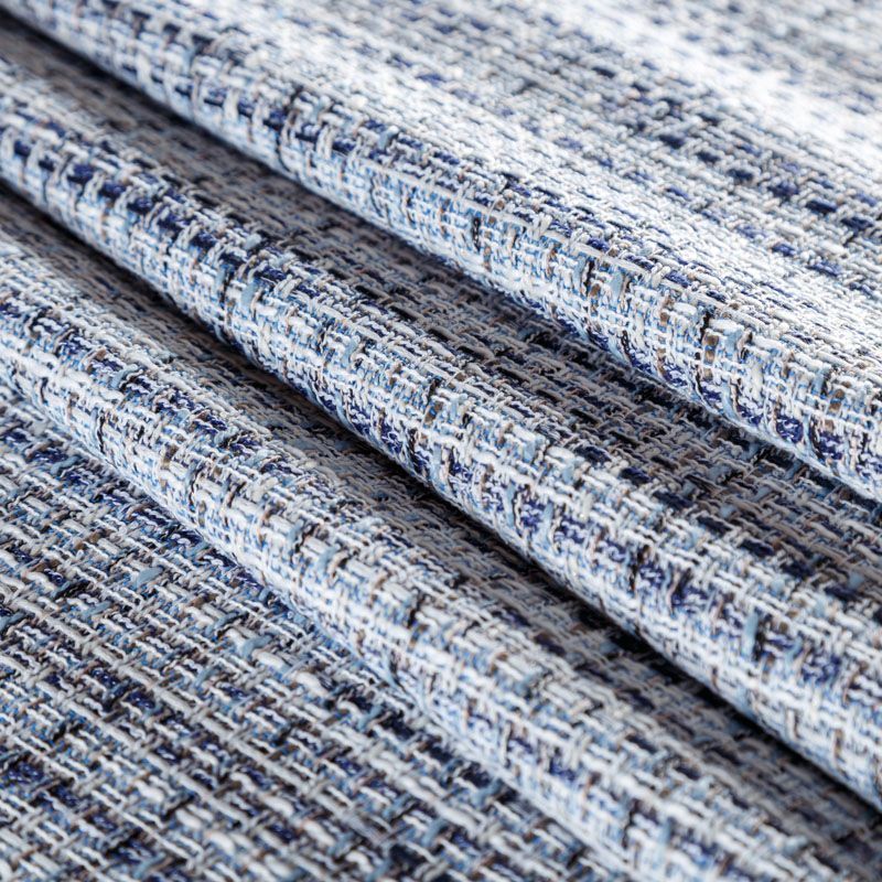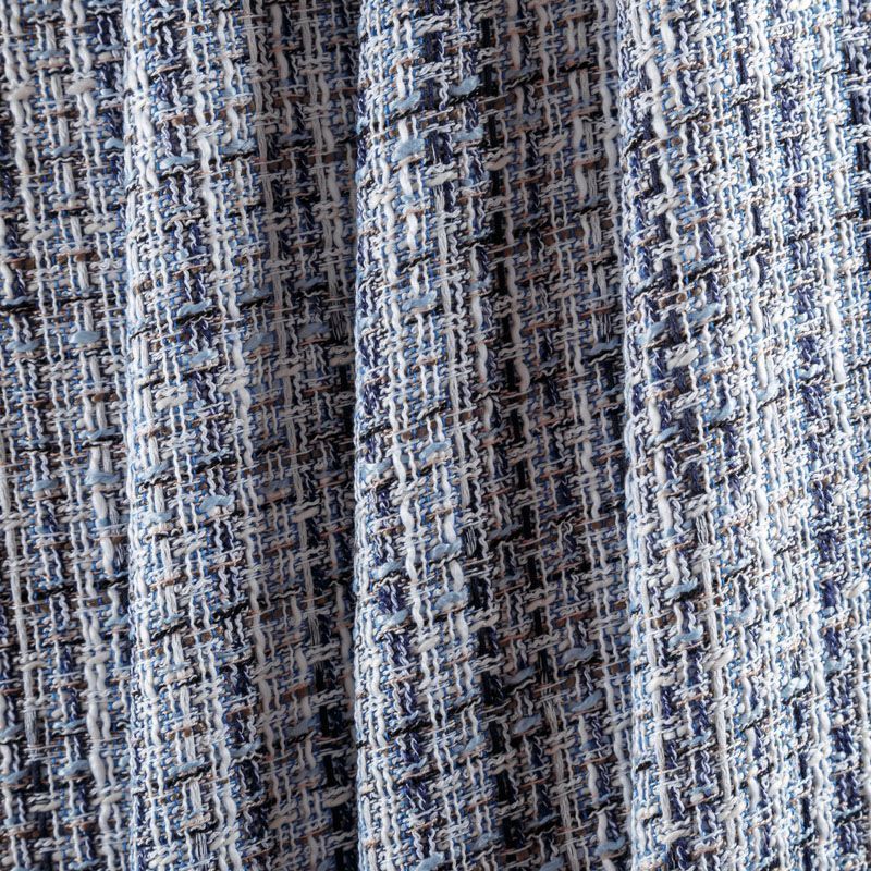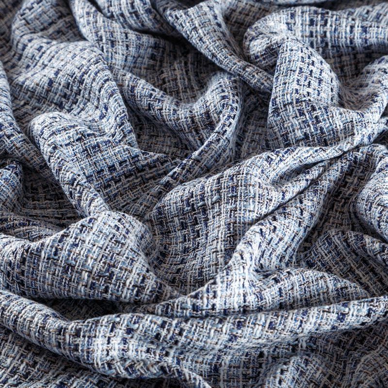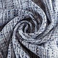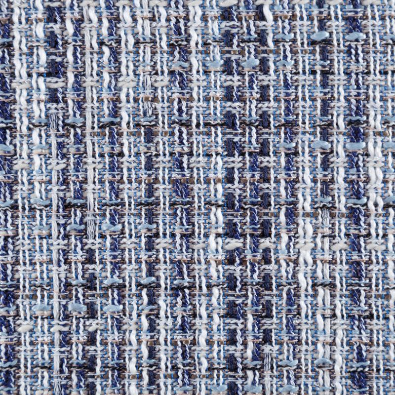 Отличительная особенность этой ткани в полотняном плетении нитей, характерного для рогожки, олицетворяющая сложную "клетчатую" геометрию в бело-голубых оттенках. Различная толщина нитей создает эффектную фактуру. Ткань неплохо держит форму, пластичная и гибкая за счет плетения,  матовая, мягкая, приятная на ощупь. Прекрасно подойдет для пошива жакета, юбки, легкого пальто, костюма, жилета, кардигана, шорт.