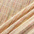 Мягкая ткань с рельефной вывязанной структурой. Буклированный твид в стиле Шанель буквально соткан из толстых разноцветных нитей, образующих рисунок в виде полоски или клетки. В плетение добавлены тесемки, волокна глянцевые и матовые. Твид идеально подходит для пошива юбок, жакетов, кардиганов, платьев и пальто в стиле Шанель.
