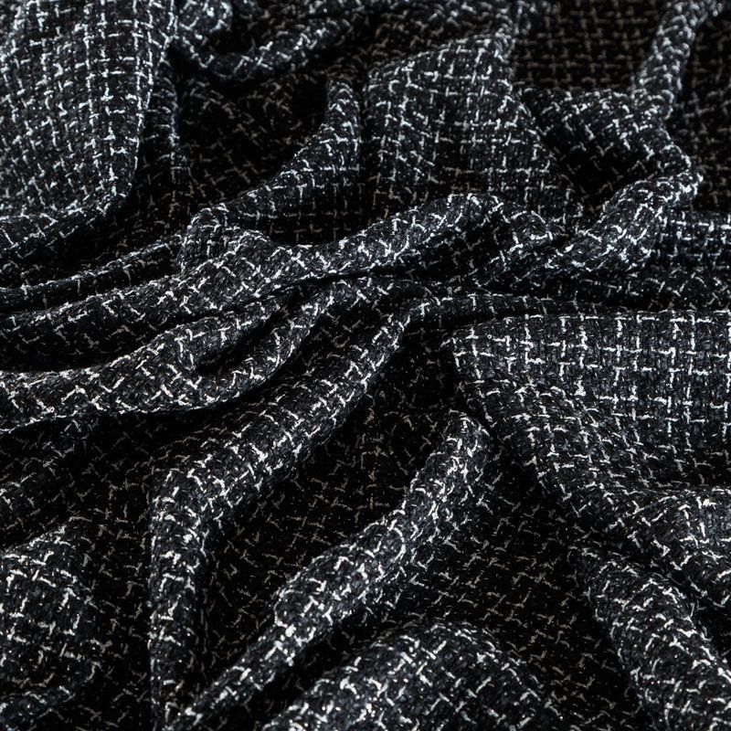 Мягкая, пластичная и объемная ткань, с разреженной и рельефной вывязанной структурой. Буклированный твид в стиле Шанель буквально соткан из различных по толщине и текстуре нитей, образующих рисунок в виде клетки. В плетение добавлена блестящая люрексная нить. Твид идеально подходит для пошива платьев, юбок, жакетов, легких пальто, эффектных бомберов и курток.