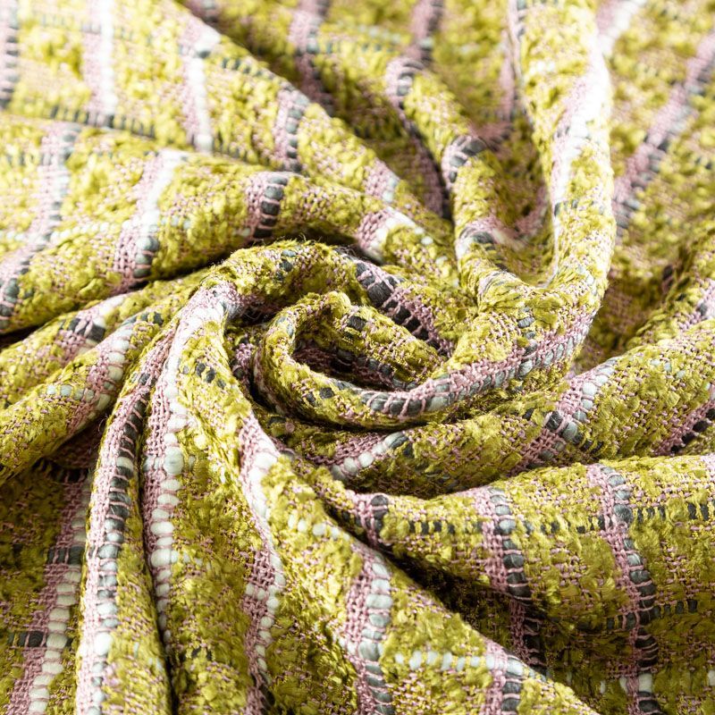 Мягкая ткань с рельефной вывязанной структурой. Буклированный твид в стиле Шанель буквально соткан из толстых цветных нитей, образующих рисунок в виде клетки. Различная толщина нитей создает эффектную фактуру. Ткань достаточно формоустойчивая, при этом пластичная, гибкая за счет плетения,  матовая, мягкая, приятная на ощупь, не рыхлая. Прекрасно подойдет для пошива жакета, юбки в виде трапеции, легкого пальто, костюма.