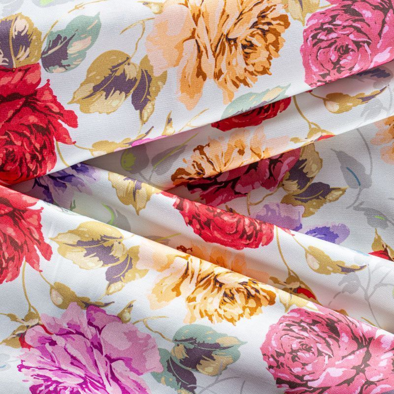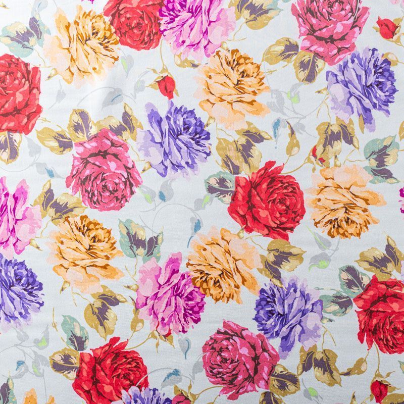 Качественный вискозный твил-штапель с цветочным принтом ярких оттенков на белом фоне. Ткань средней плотности, имеет саржевое плетение и характерный диагональный рубчик на поверхности. Хорошо сохраняет форму, не сильно мнется и не деформируется в процессе эксплуатации.  Красиво ложится в складки, поэтому прекрасно подойдет на длинные драпированные юбки и платья, туники, на свободные брюки или шорты, топы.