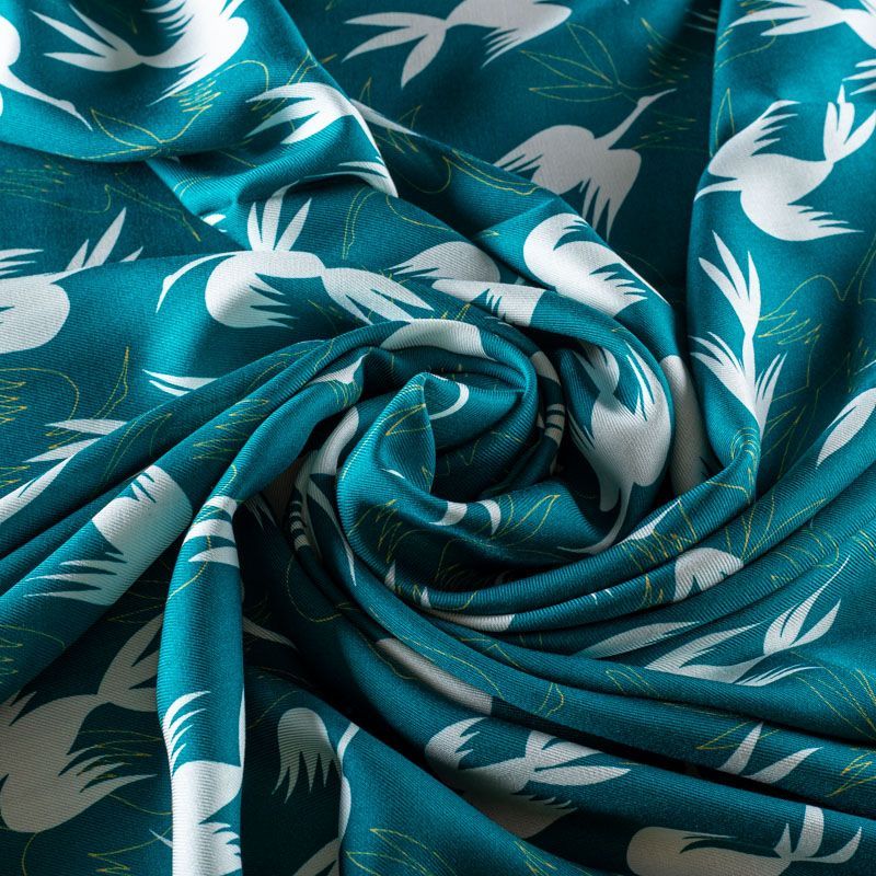 Итальянский вискозный твил-штапель со стилизованным принтом в виде летящих птици темно-бирюзового оттенка. Мягкая ткань средней плотности, имеет саржевое плетение и характерный диагональный рубчик на поверхности. Хорошо сохраняет форму, не сильно мнется и не деформируется в процессе эксплуатации.  Красиво ложится в складки, поэтому прекрасно подойдет на длинные драпированные юбки и платья, туники, на свободные брюки или шорты, топы.