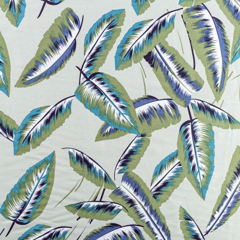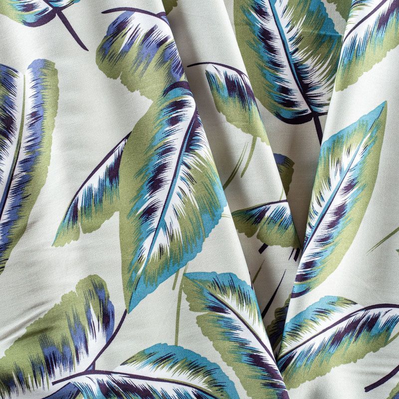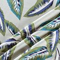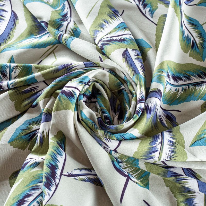 Качественный твил-штапель с крупным растительным принтом на спокойном фоне. Мягкая ткань средней плотности, имеет саржевое плетение и характерный диагональный рубчик на поверхности. Хорошо сохраняет форму, не сильно мнется и не деформируется в процессе эксплуатации.  Красиво ложится в складки, поэтому прекрасно подойдет на длинные драпированные юбки и платья, на свободные брюки или шорты, топы.