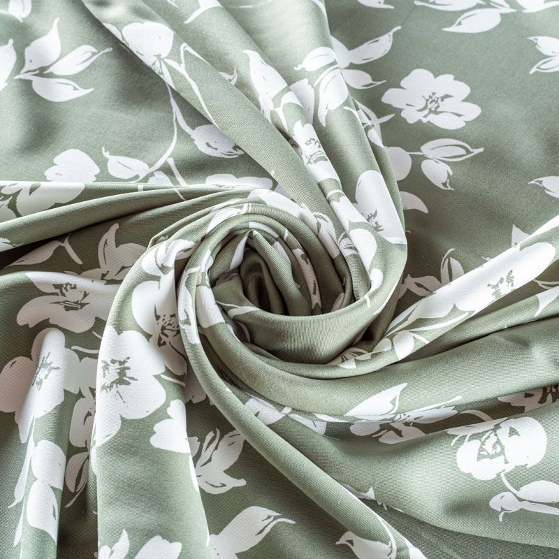 Качественный твил-штапель с белым цветочным принтом на фисташковом фоне. Мягкая ткань средней плотности, имеет саржевое плетение и характерный диагональный рубчик на поверхности. Хорошо сохраняет форму, не сильно мнется и не деформируется в процессе эксплуатации. Красиво ложится в складки, поэтому прекрасно подойдет на длинные драпированные юбки и платья, на свободные брюки или шорты, топы.