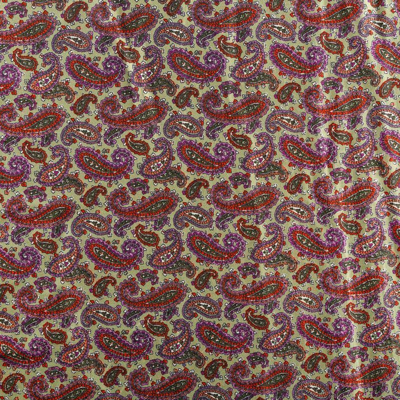 Плотная и мягкая ткань фисташкового цвета с цветным узором пейсли, имеет саржевое плетение и характерный диагональный рубчик на поверхности. Отлично сохраняет форму, не сильно мнется и не деформируется в процессе эксплуатации. Красиво ложится в складки, поэтому прекрасно подойдет на длинные драпированные юбки и платья, на свободные брюки или шорты, топы.