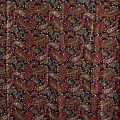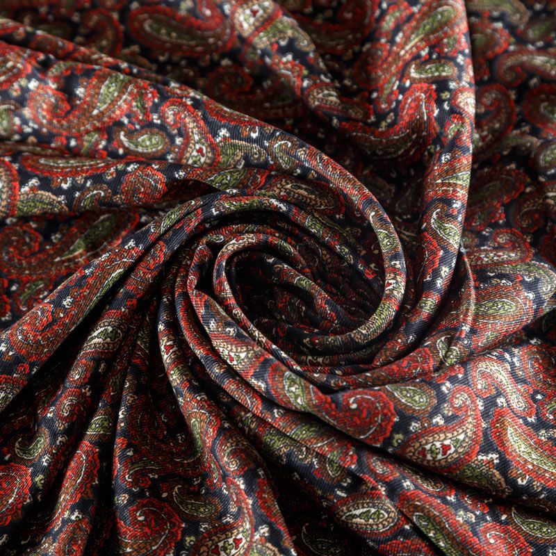 Плотная и мягкая ткань черного цвета с узором пейсли в красно-зеленых оттенках, имеет саржевое плетение и характерный диагональный рубчик на поверхности. Отлично сохраняет форму, не сильно мнется и не деформируется в процессе эксплуатации. Красиво ложится в складки, поэтому прекрасно подойдет на длинные драпированные юбки и платья, на свободные брюки или шорты, топы.