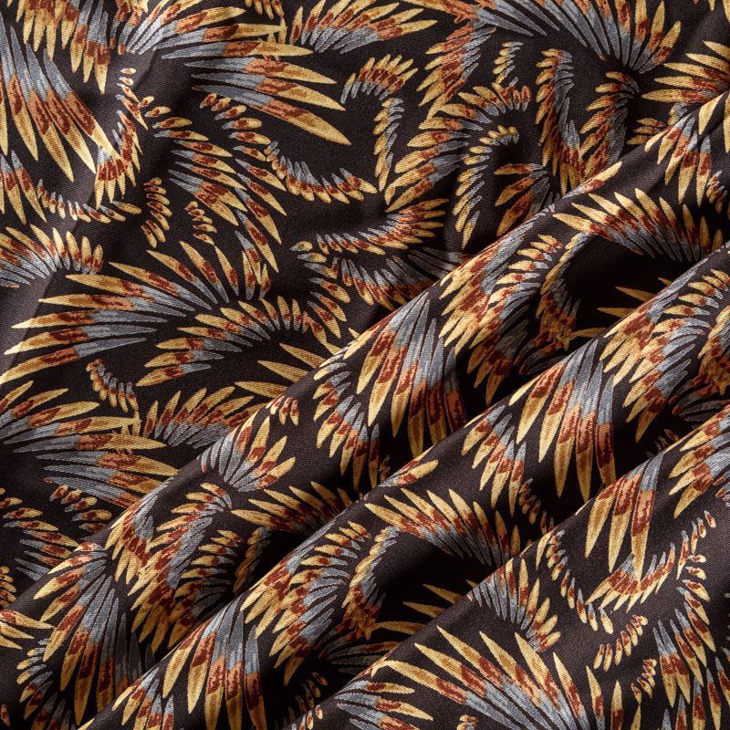 Плотная и мягкая ткань черного цвета с фантазийным принтом, имеет саржевое плетение и характерный диагональный рубчик на поверхности. Отлично сохраняет форму, не сильно мнется и не деформируется в процессе эксплуатации. Красиво ложится в складки, поэтому прекрасно подойдет на длинные драпированные юбки и платья, на свободные брюки или шорты, топы.