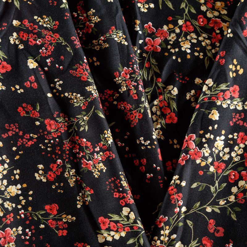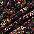 Плотная и мягкая ткань черного цвета с ярким мелкоцветом, имеет саржевое плетение и характерный диагональный рубчик на поверхности. Отлично сохраняет форму, не сильно мнется и не деформируется в процессе эксплуатации. Красиво ложится в складки, поэтому прекрасно подойдет на длинные драпированные юбки и платья, на свободные брюки или шорты, топы.