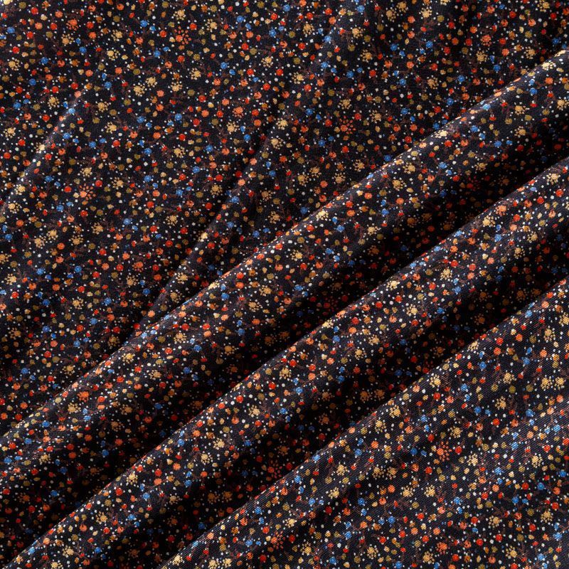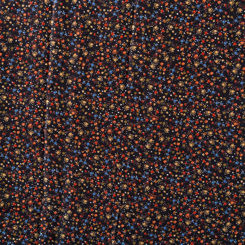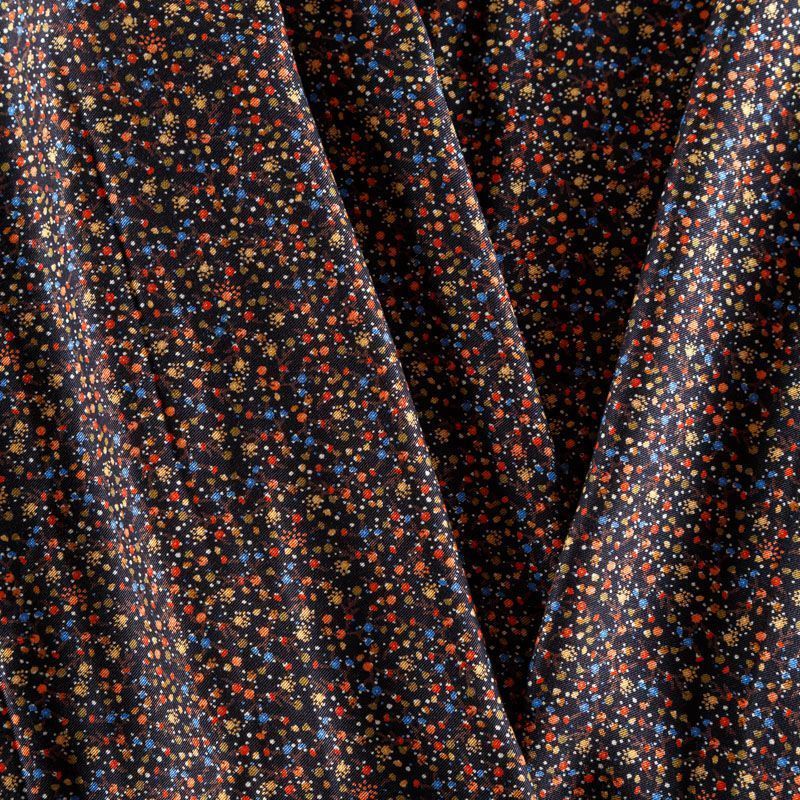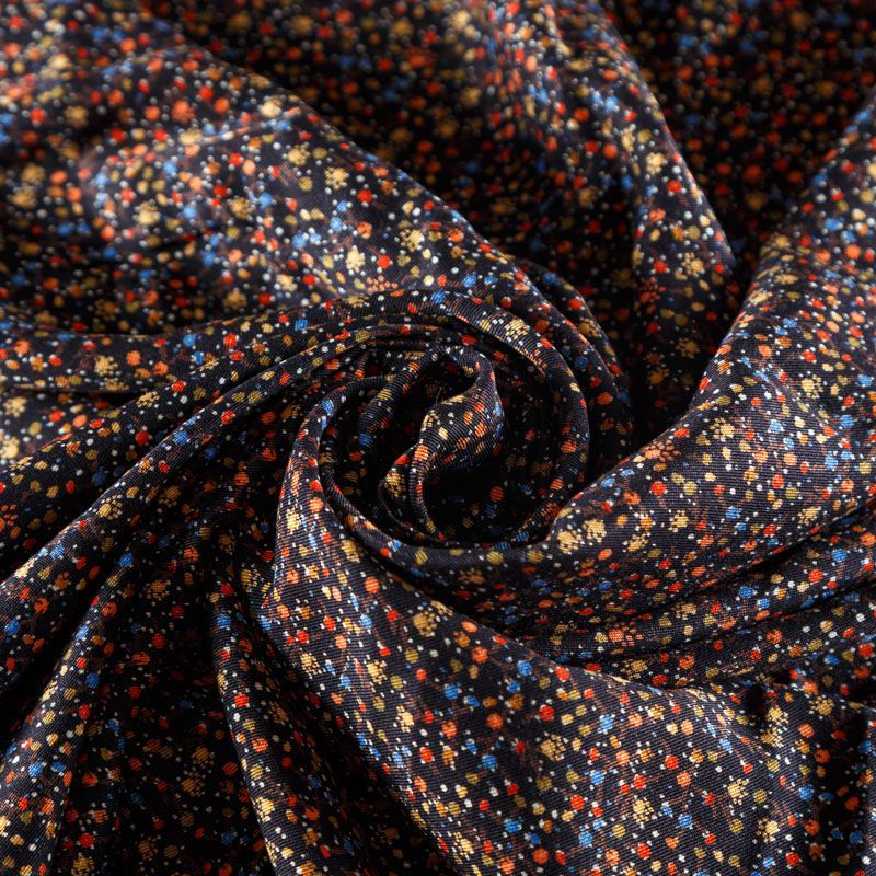 Плотная и мягкая ткань черного цвета с ярким мелкоцветом, имеет саржевое плетение и характерный диагональный рубчик на поверхности. Отлично сохраняет форму, не сильно мнется и не деформируется в процессе эксплуатации. Красиво ложится в складки, поэтому прекрасно подойдет на длинные драпированные юбки и платья, на свободные брюки или шорты, топы.