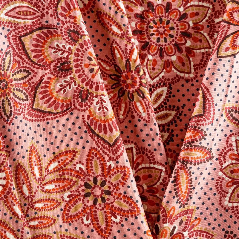 Плотная и мягкая ткань припыленного розового оттенка со стилизованным цветочным орнаментом, имеет саржевое плетение и характерный диагональный рубчик на поверхности. Отлично сохраняет форму, не сильно мнется и не деформируется в процессе эксплуатации. Красиво ложится в складки, поэтому прекрасно подойдет на длинные драпированные юбки и платья, на свободные брюки или шорты, топы.