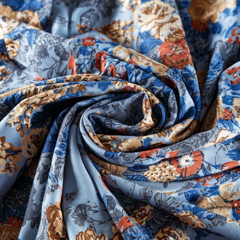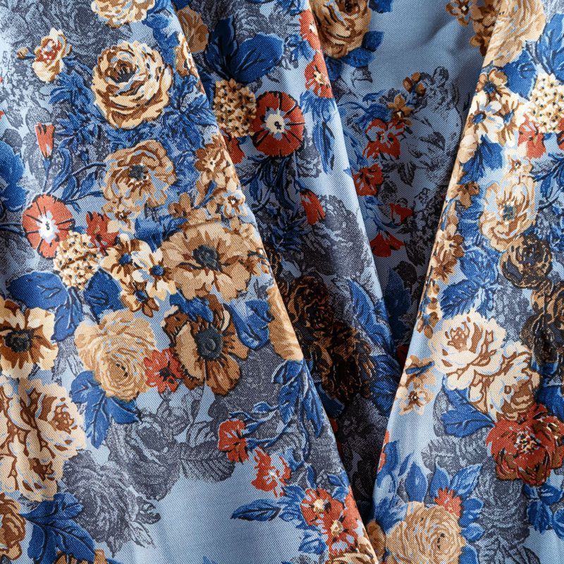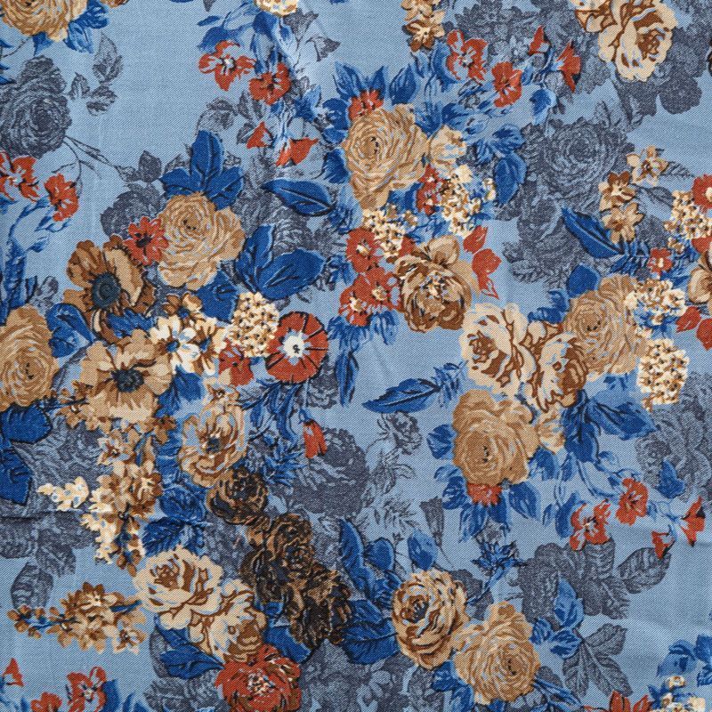 Плотная и мягкая ткань холодного голубого оттенка с цветочным принтом, имеет саржевое плетение и характерный диагональный рубчик на поверхности. Отлично сохраняет форму, не сильно мнется и не деформируется в процессе эксплуатации. Красиво ложится в складки, поэтому прекрасно подойдет на длинные драпированные юбки и платья, на свободные брюки или шорты, топы.