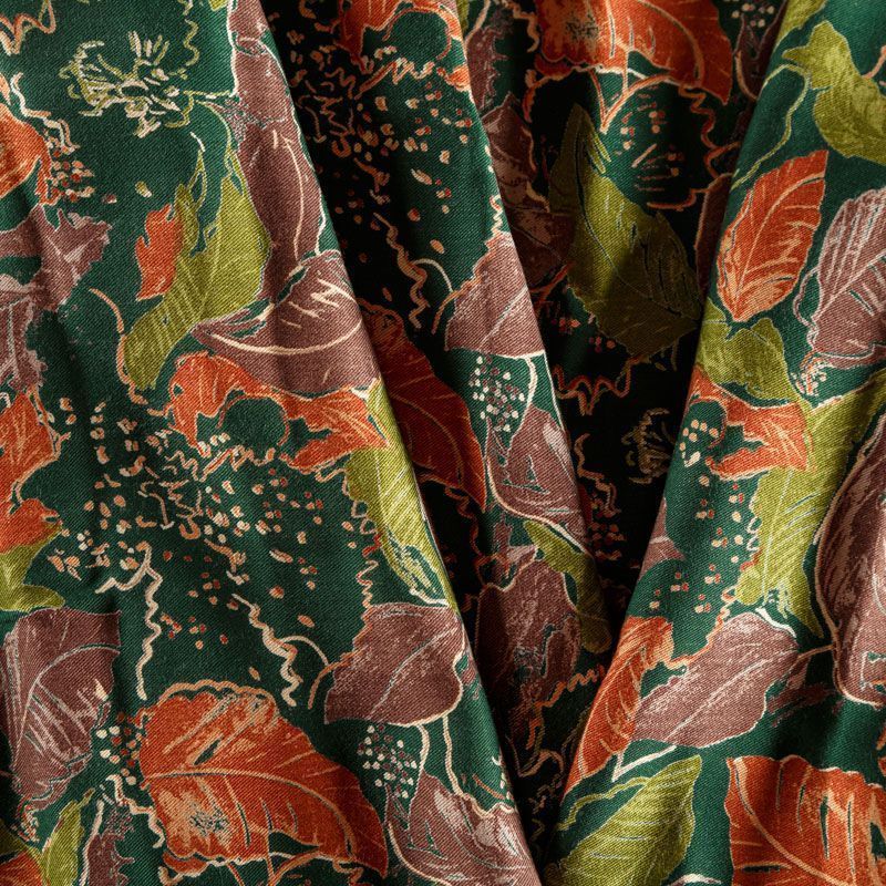 Плотная и мягкая ткань темно-зеленого цвета с растительным принтом в осенних оттенках, имеет саржевое плетение и характерный диагональный рубчик на поверхности. Отлично сохраняет форму, не сильно мнется и не деформируется в процессе эксплуатации. Красиво ложится в складки, поэтому прекрасно подойдет на длинные драпированные юбки и платья, на свободные брюки или шорты, топы, комбинезоны, а также для домашней одежды.